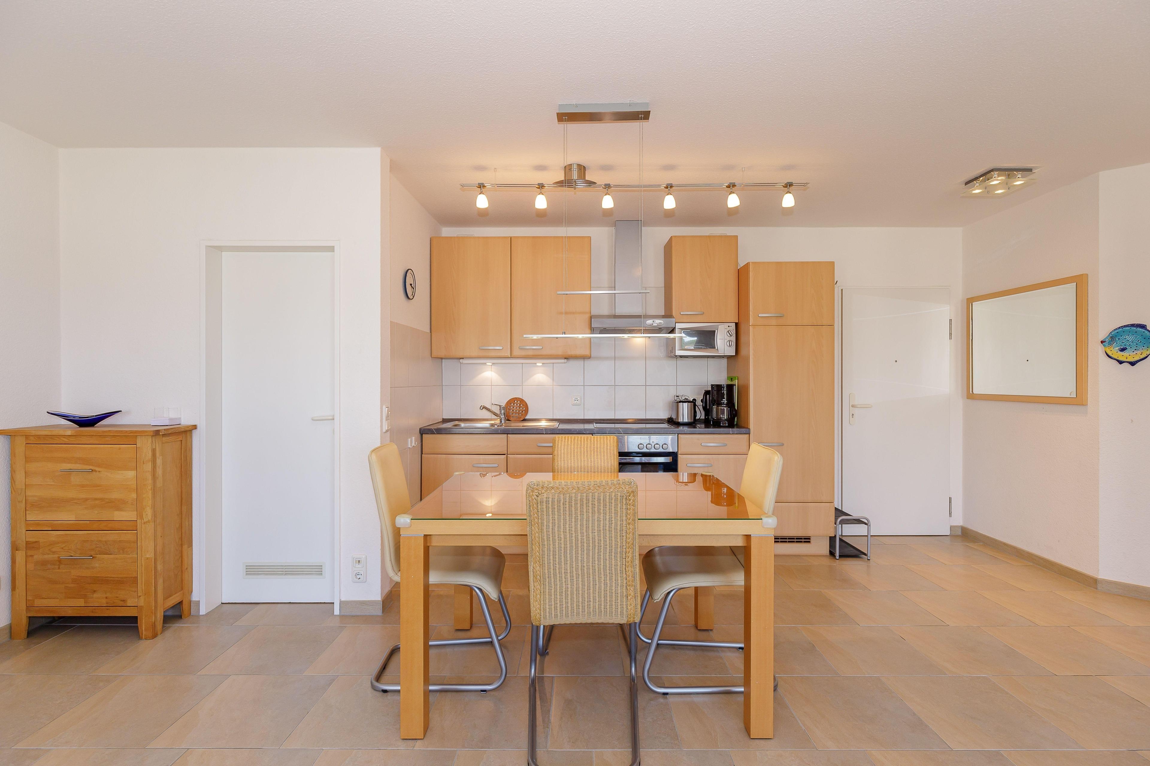 Daran anschließend befinden sich ein Esstisch für 4 Personen und eine Pantry-Küche, die mit allen Küchenutensilien ausgestattet ist, die in einer guten Küche nicht fehlen dürfen.