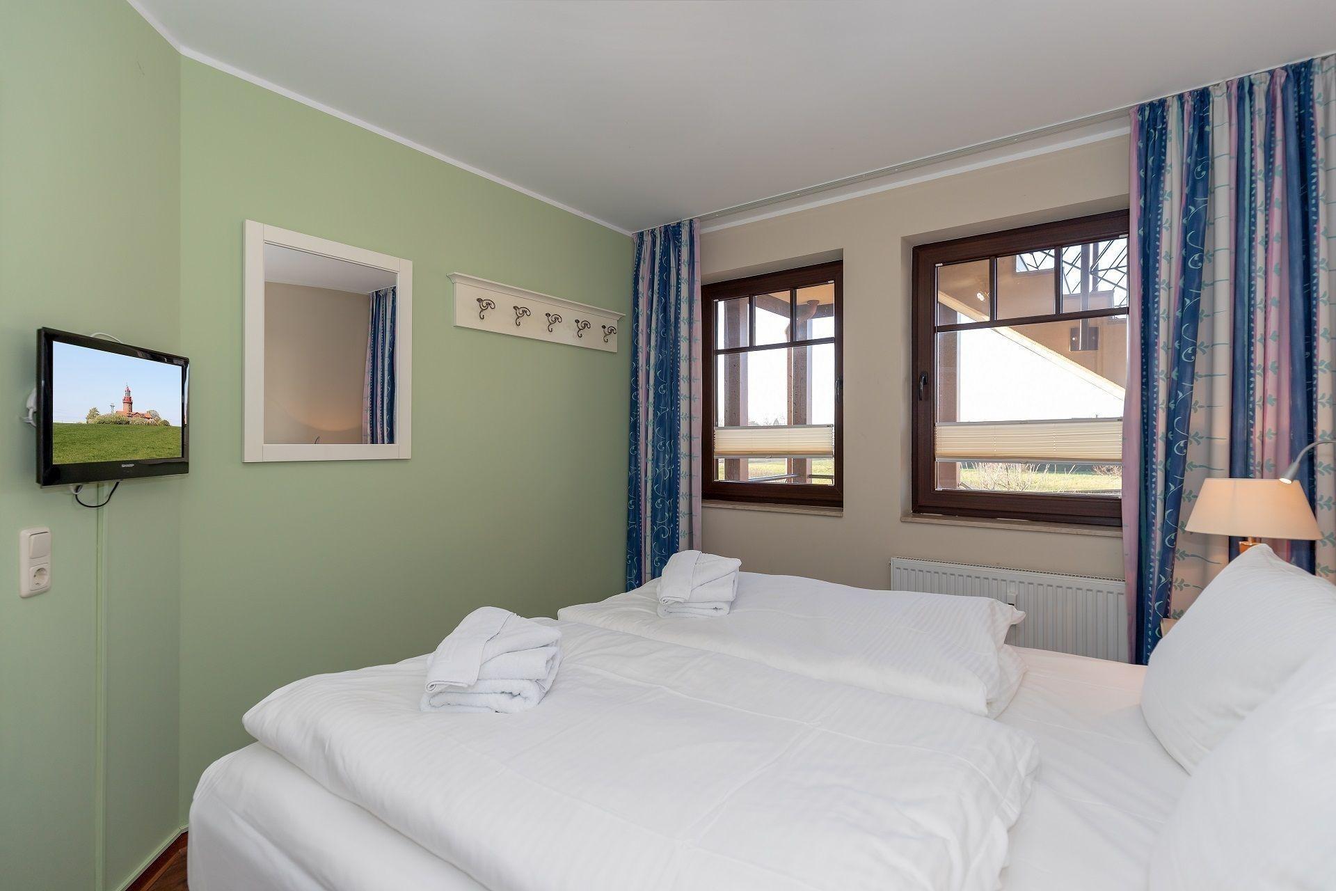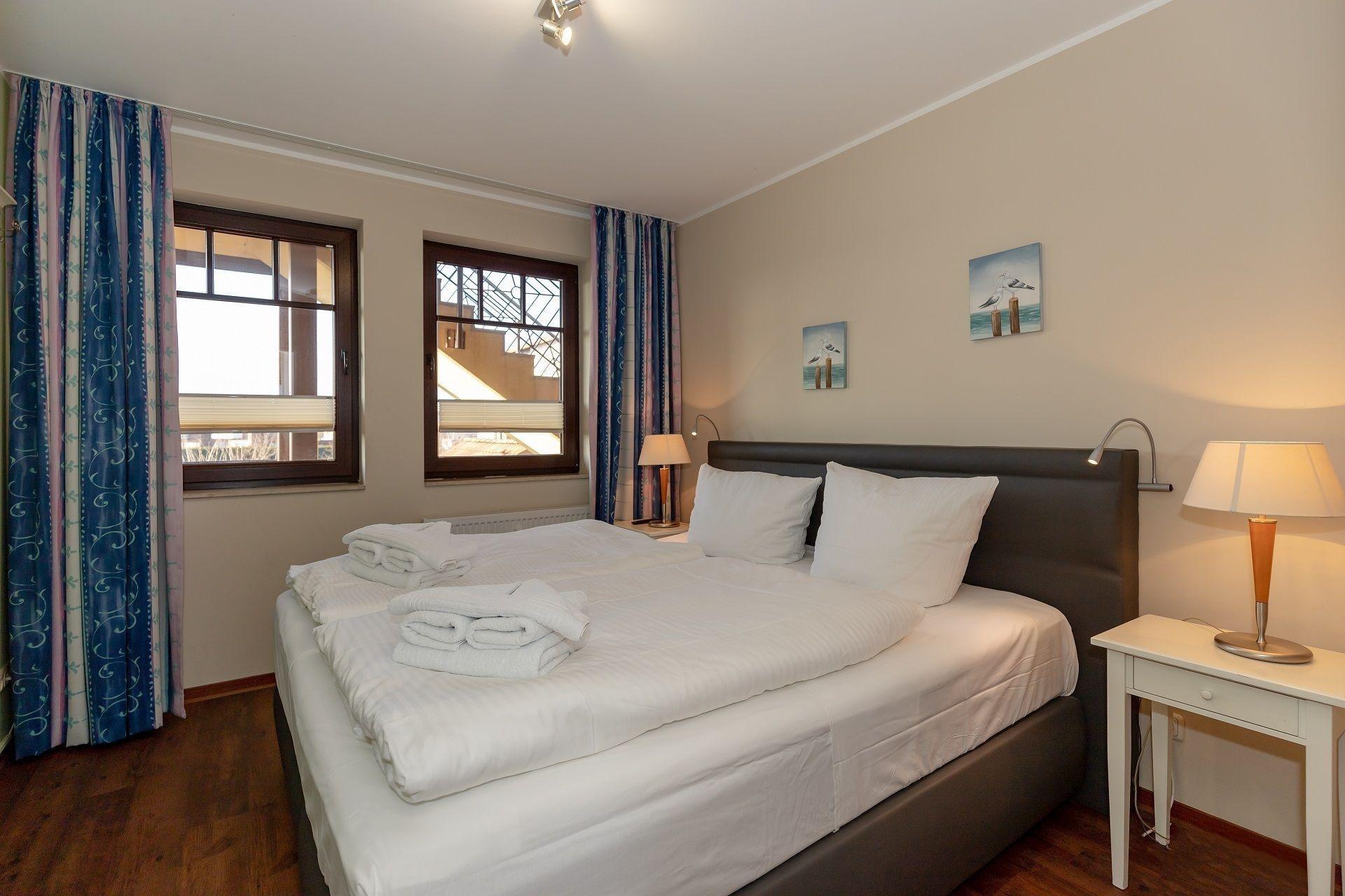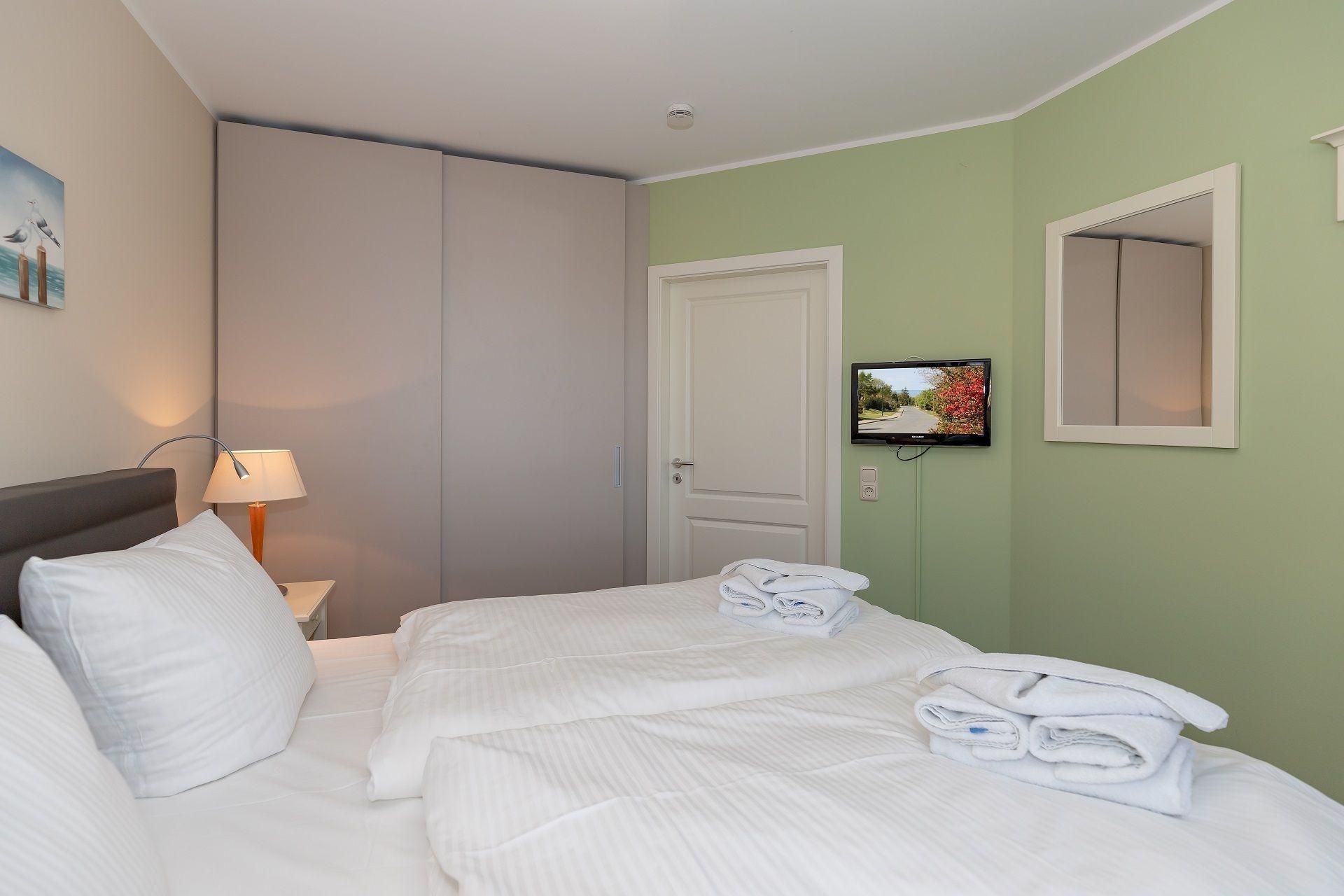 Das Schlafzimmer ist mit einem Boxspringbett, einem geräumigen Kleiderschrank und einem Fernseher ausgestattet. Hier finden Sie erholsame (Urlaubs-)Träume.