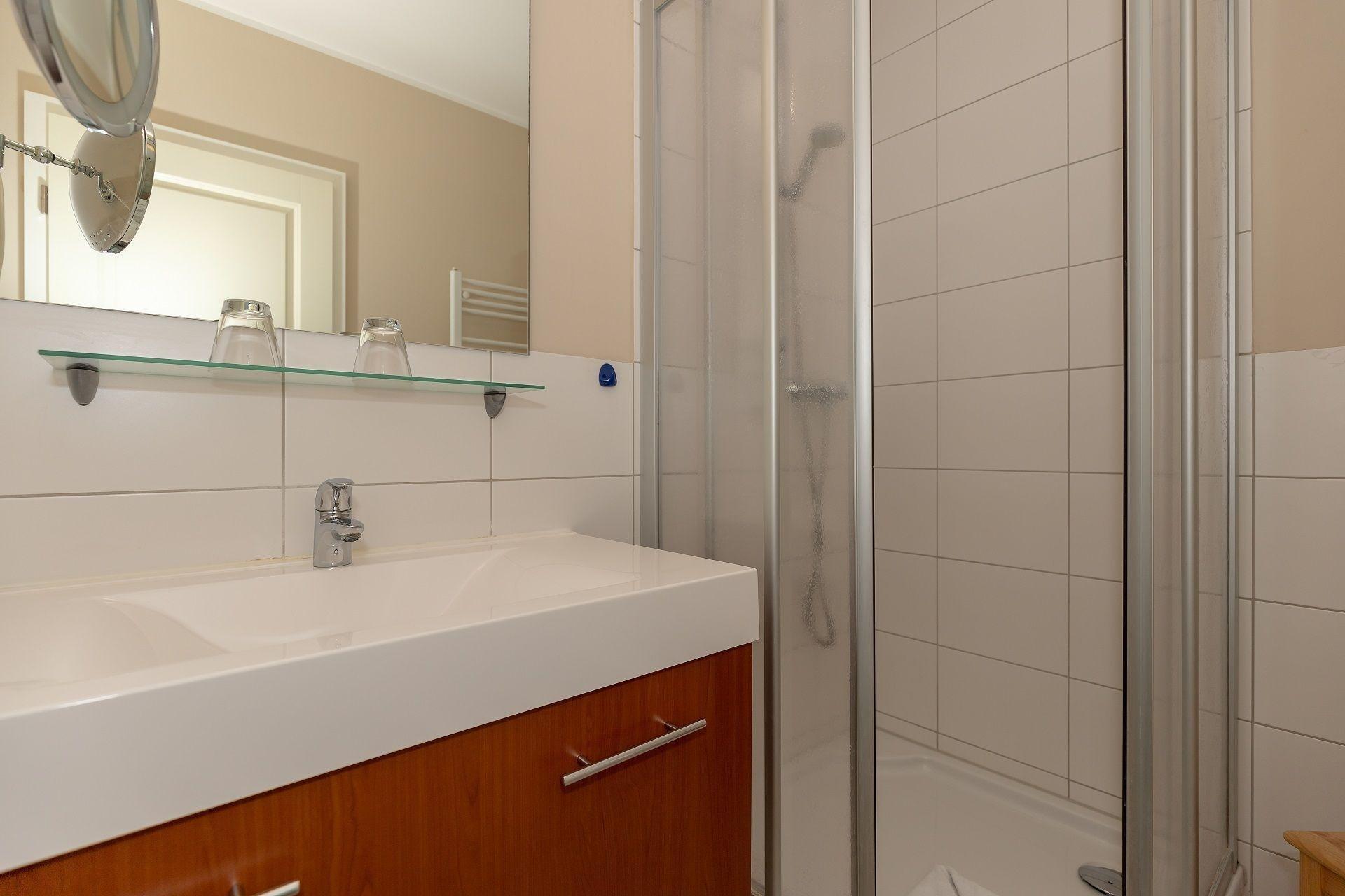 Die Wohnung verfügt über ein Badezimmer mit Dusche, Waschbecken mit Unterschrank, einen beleuchteten Kosmetikspiegel und einen Föhn.
