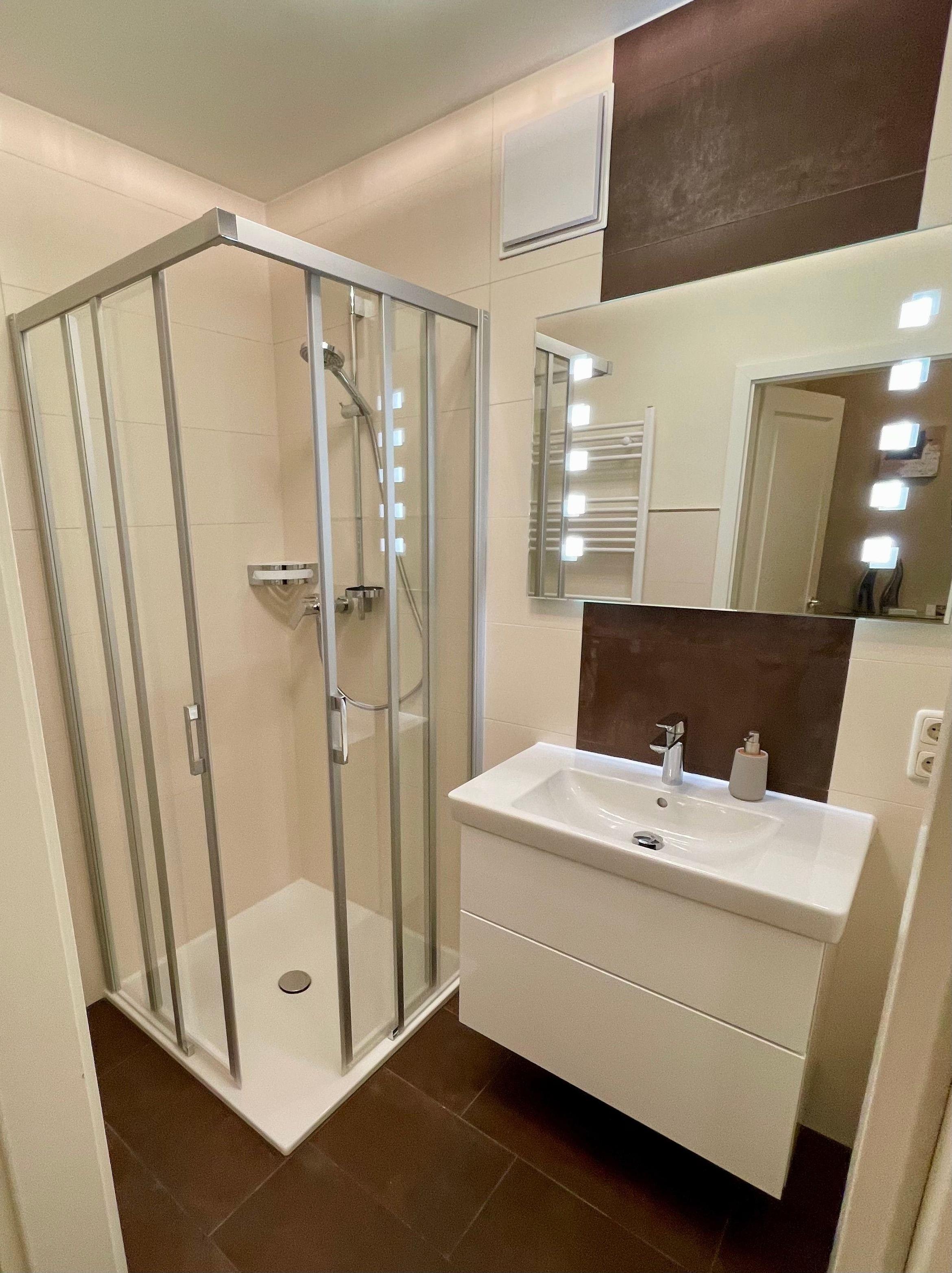 Im 2024 komplett renovierten Bad bietet Ihnen eine bodentiefe Dusche nun noch mehr Komfort. Zur hochwertigen Ausstattung gehören weiterhin ein großzügiger Waschtisch mit zwei Schubladen, ein Föhn, ein großer, beleuchteter Spiegel sowie ein Handtuchheizkörper.