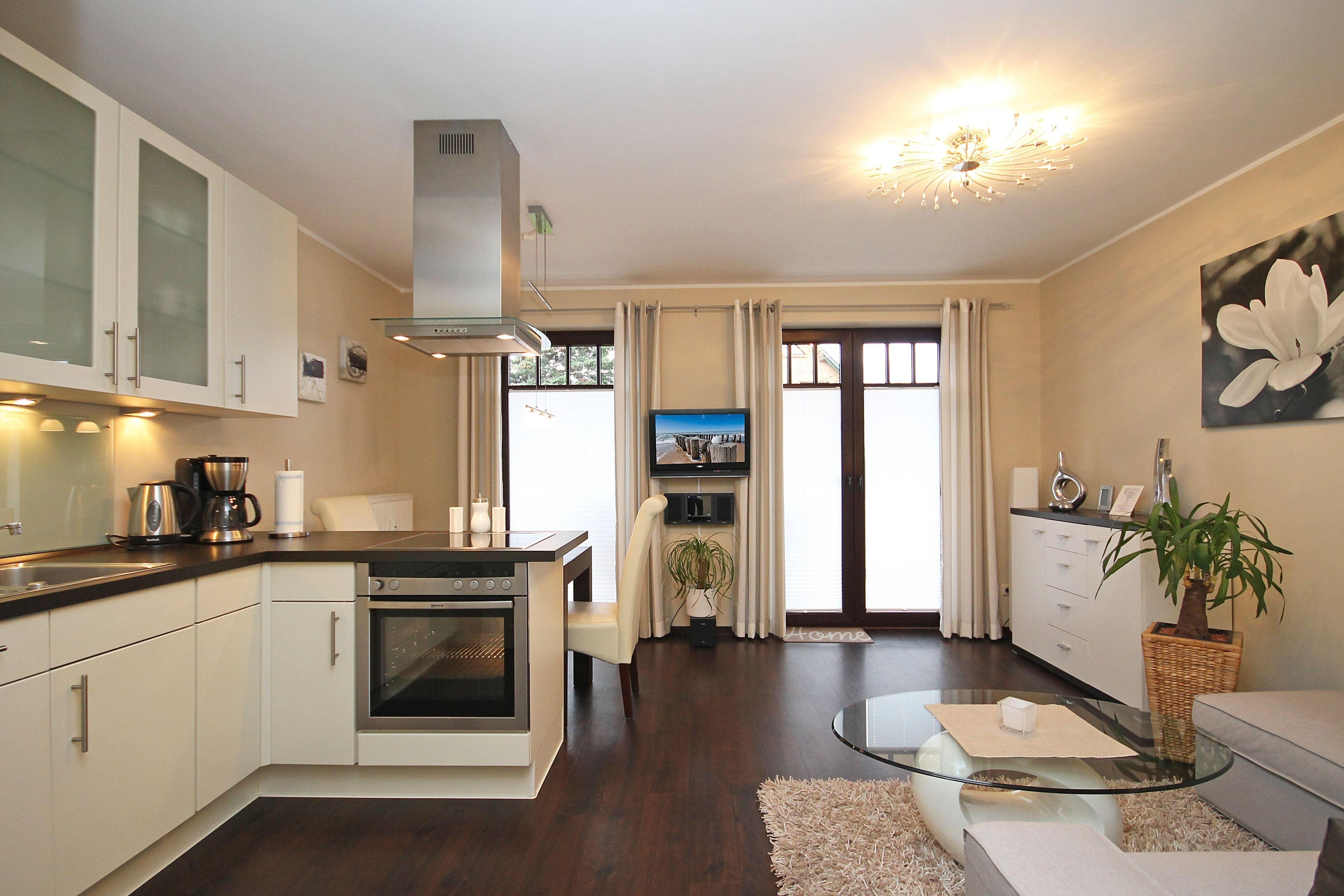 Die Ferienwohnung ist komfortabel und stilvoll eingerichtet und befindet sich im Erdgeschoss des Hauses 4 mit einer nach Süd/West ausgerichteten, sonnigen Terrasse. Der Fußboden ist mit hochwertigem Linoleum in Dielenoptik ausgelegt.