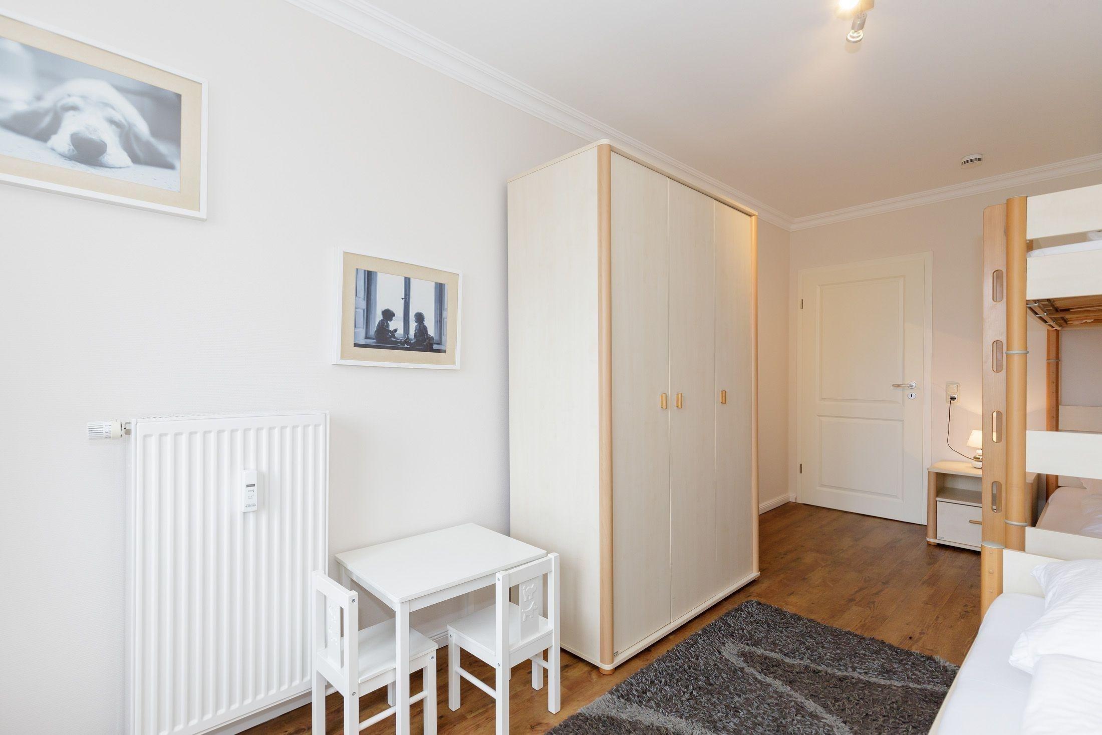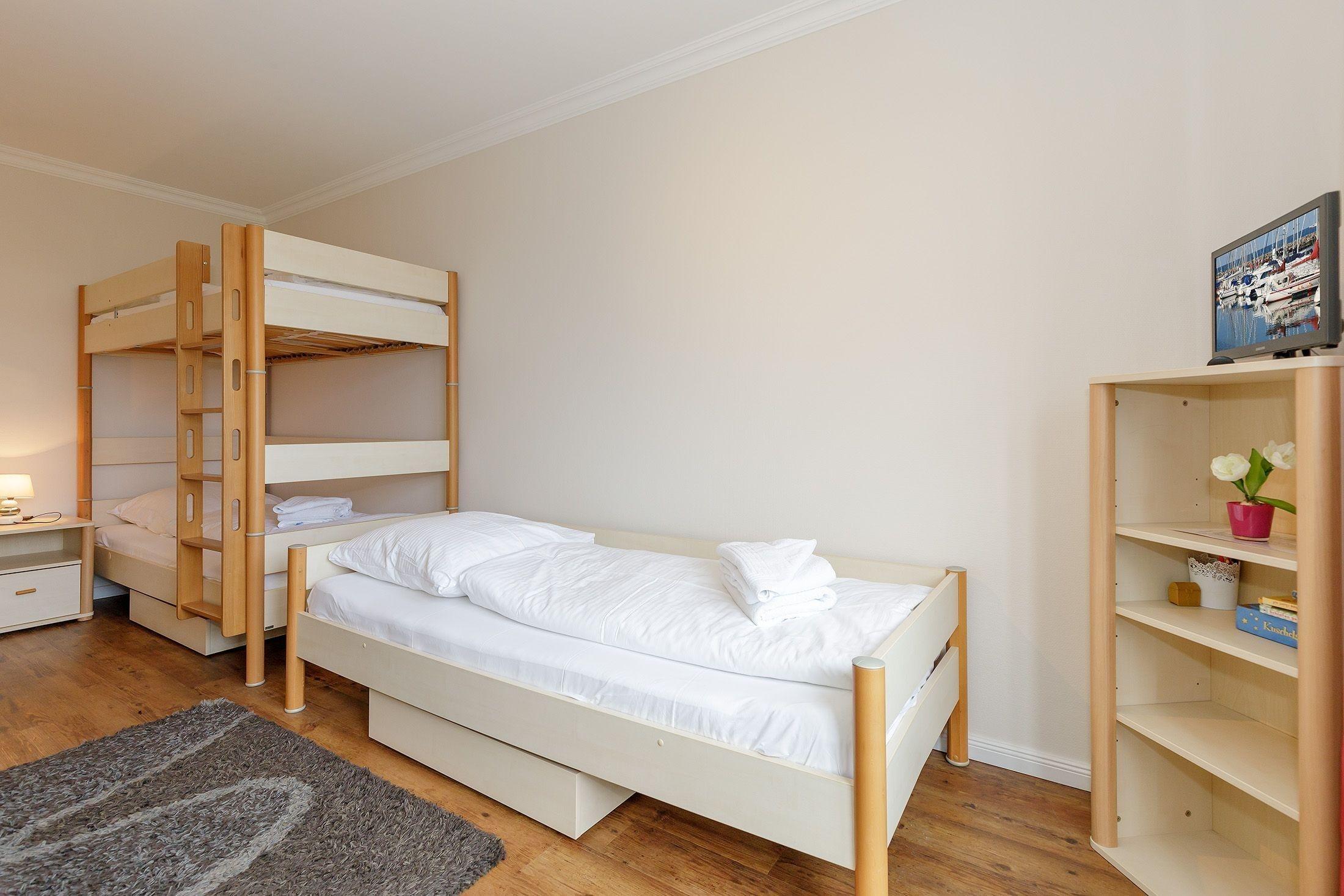 Im zweiten Schlafzimmer befinden sich ein Einzelbett sowie ein Zweier-Etagenbett, wobei der Einstieg in die untere Ebene durch einen großzügigen Bettenabstand vereinfacht wurde. Ein kleiner Fernseher steht hier ebenfalls zur Verfügung. Für Ihre Kinder haben wir einen kleinen Maltisch bereitgestellt.