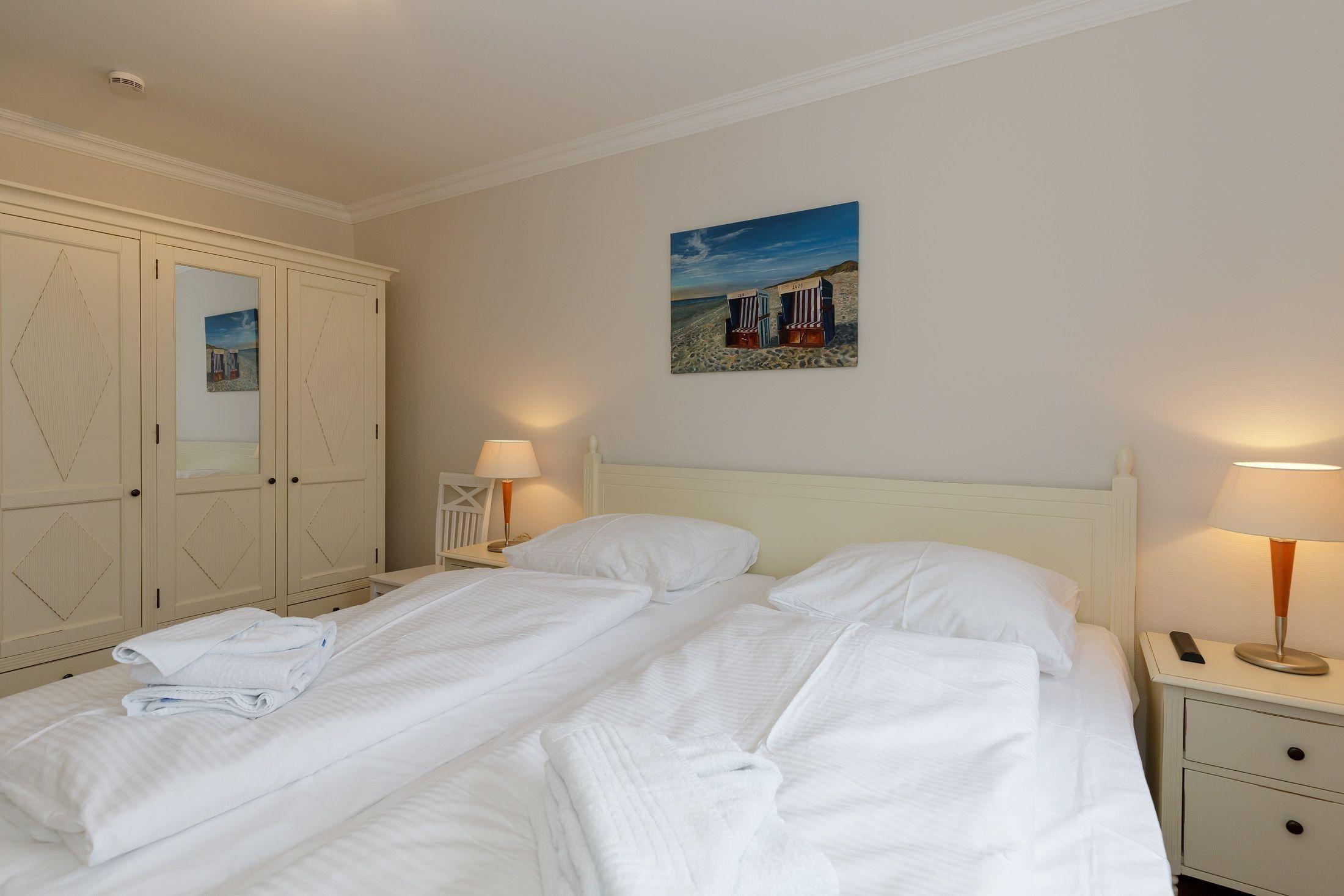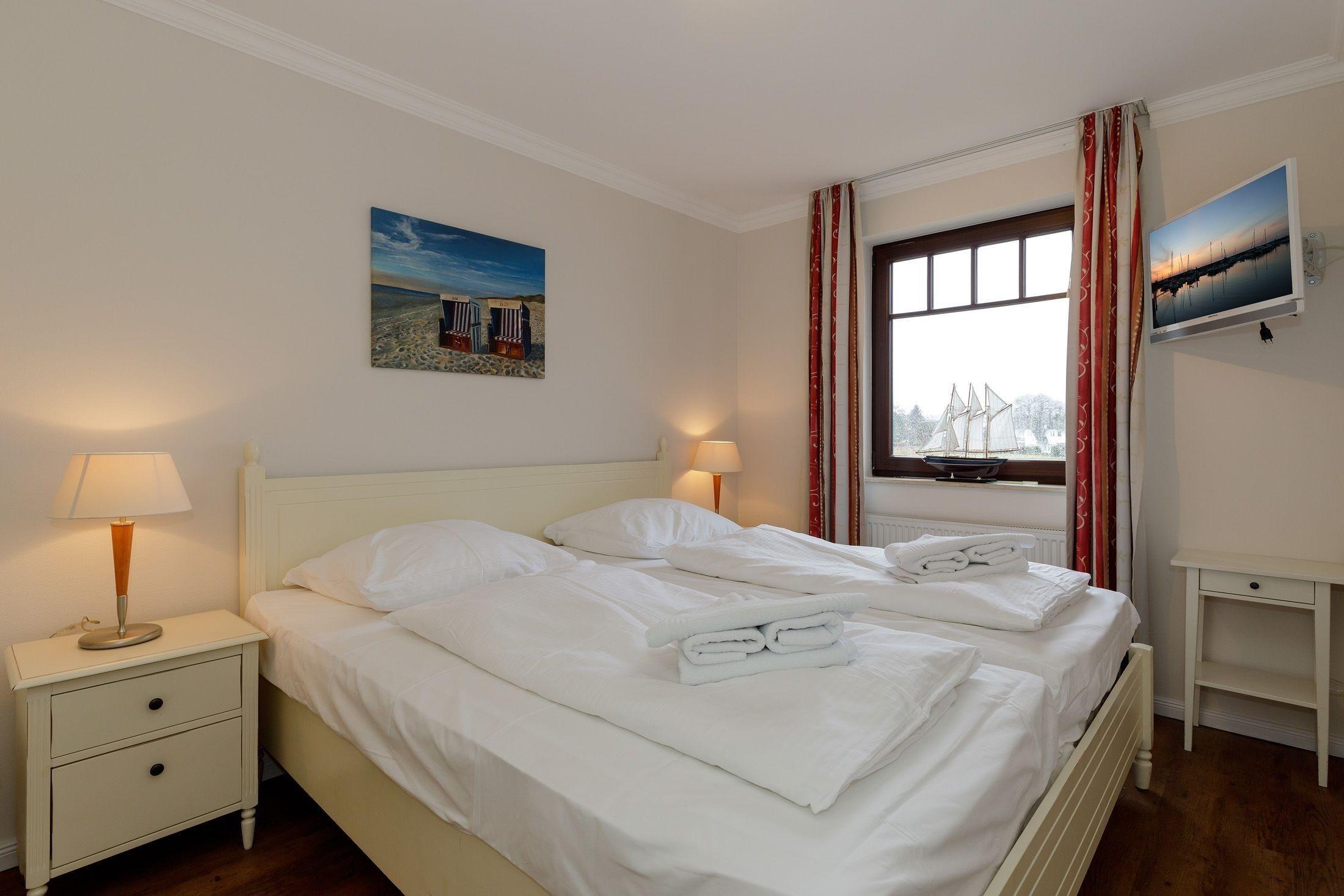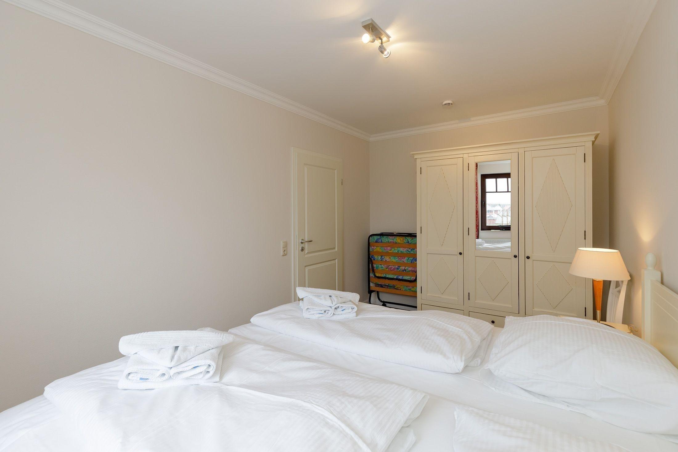 In einem Schlafzimmer befindet sich ein komfortables, extra großes Doppelbett (2,10 lang) mit einem geräumigen Kleiderschrank sowie einem weiteren Fernseher.