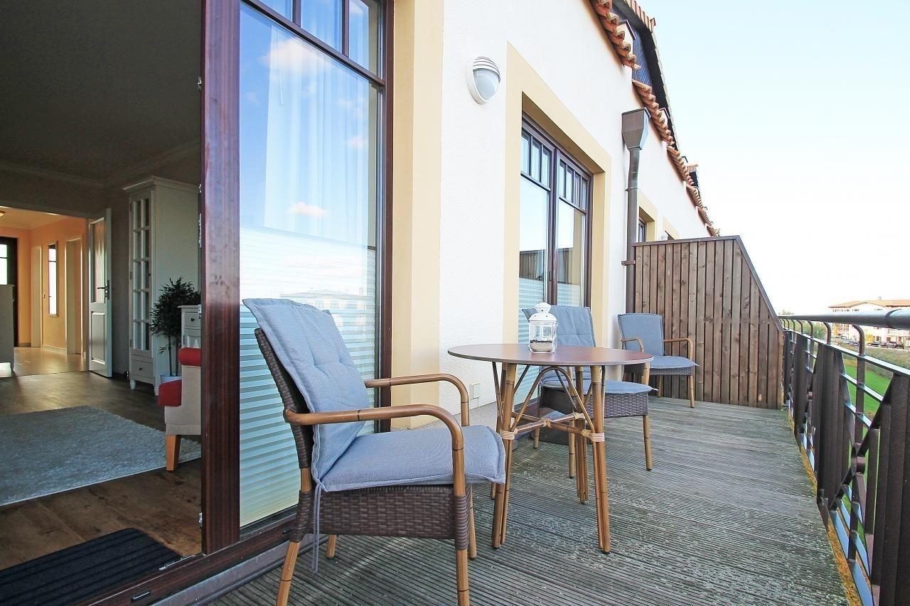 Die Wohnung besitzt einen Balkon mit 4 Sitzgelegenheiten und einem Tisch, der nach Osten gelegen ist. Hier können Sie "Sonne satt" genießen und auch bis zum Yachthafen und aufs Meer schauen.