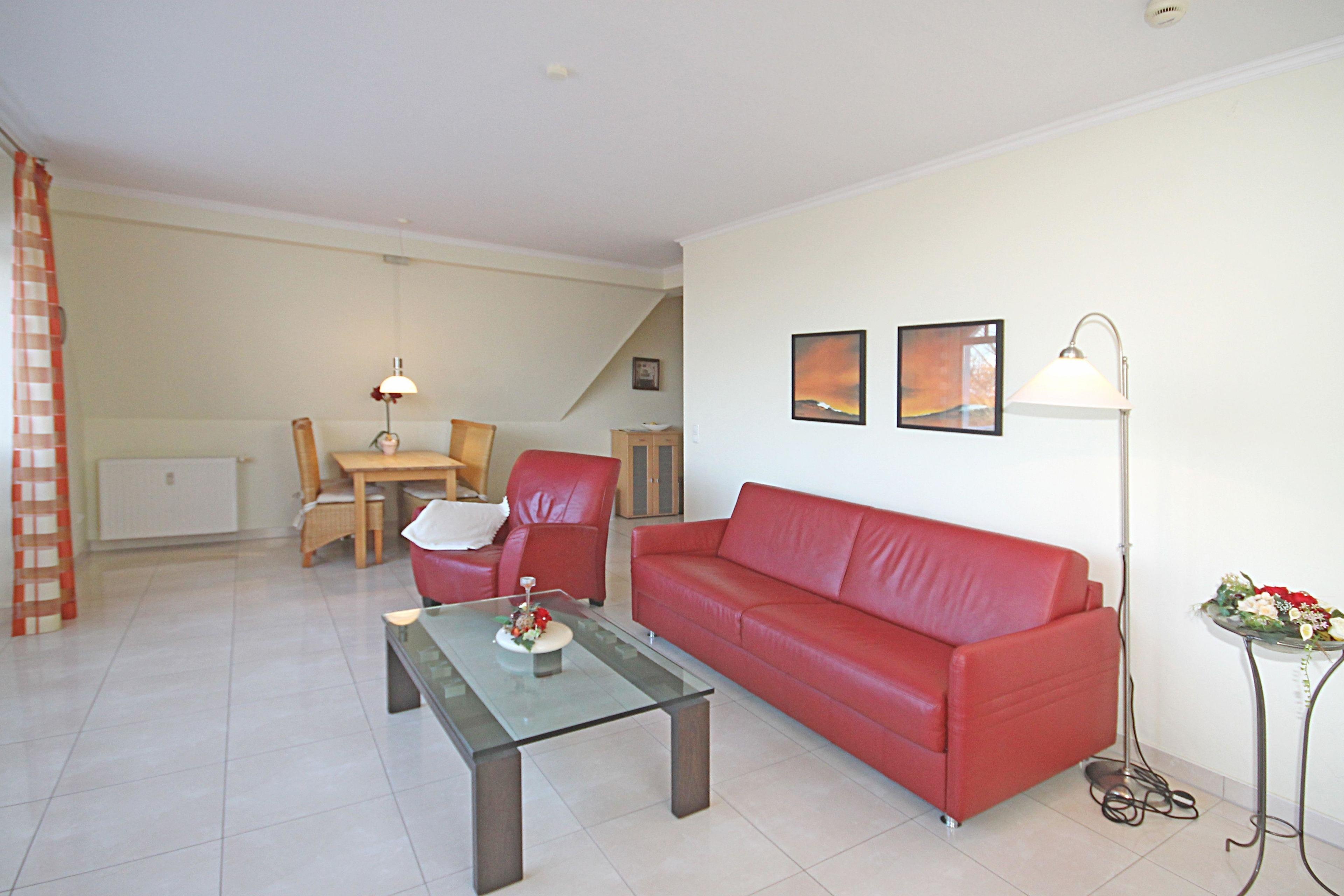 Der großzügige Wohnraum, ca. 40 m² groß und im italienischen Stil eingerichtet, erfüllt selbst höchste Ansprüche und bietet Ihnen einen optimalen Aufenthalt und einen entspannten Urlaub. Hier steht Ihnen eine Sofa-Garnitur nebst Sessel zur Verfügung. In dieser gemütlichen Atmosphäre können Sie einen ereignisreichen Tag gemeinsam bei einem leckeren Getränk ausklingen lassen. Das Sofa ist ausziehbar und bietet 2 Personen einen Schlafplatz für die Nacht.