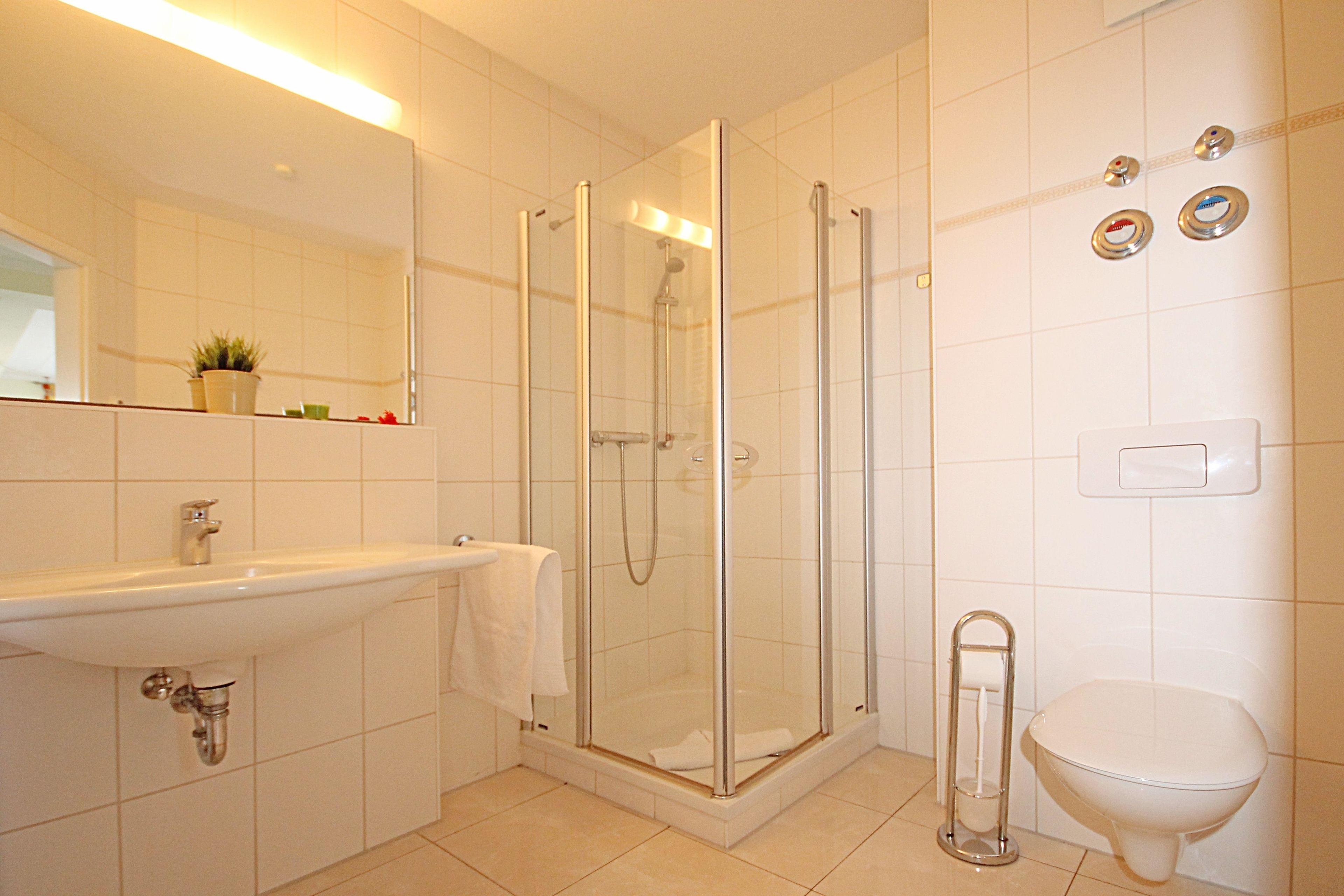 Das Badezimmer ist mit einer Dusche, einem WC und einem Waschtisch und großem Spiegel ausgestattet.