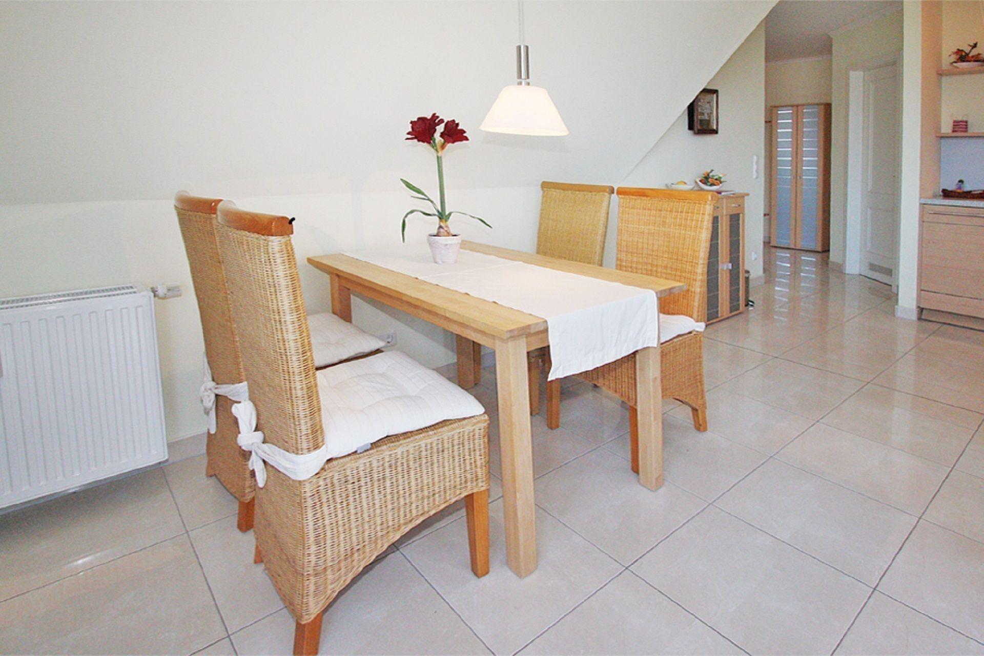 Der Küchenbereich beinhaltet einen Esstisch mit vier Stühlen sowie eine voll ausgestattete Küche, die Ihnen alle Bequemlichkeiten für die Zubereitung Ihrer Mahlzeiten bietet.