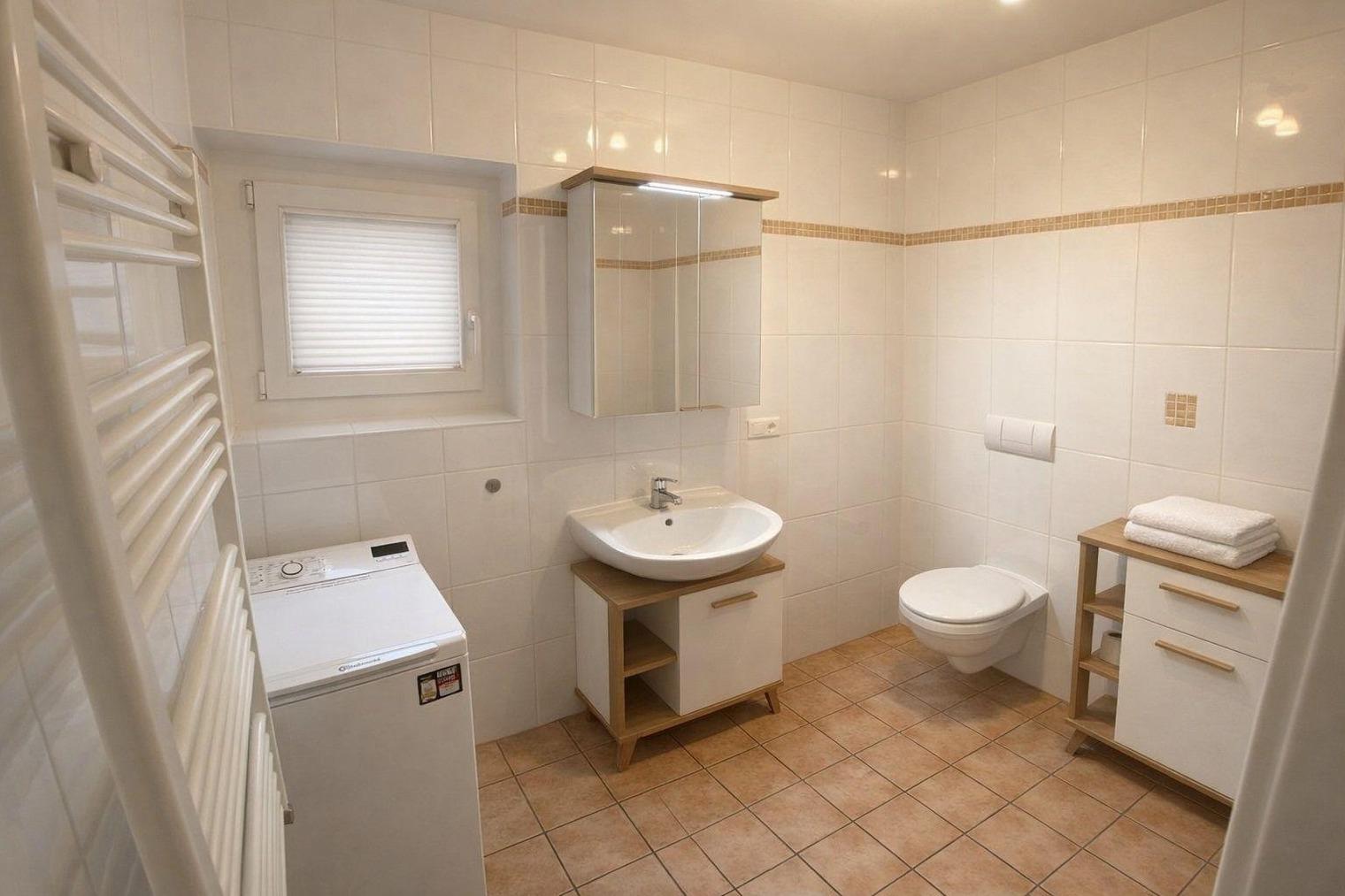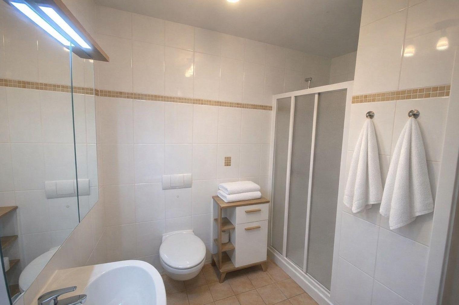 Das Badezimmer ist mit einem WC, einer Dusche, einem Föhn, einem Waschbecken mit Unterschrank sowie einem Handtuchtrockner ausgestattet.