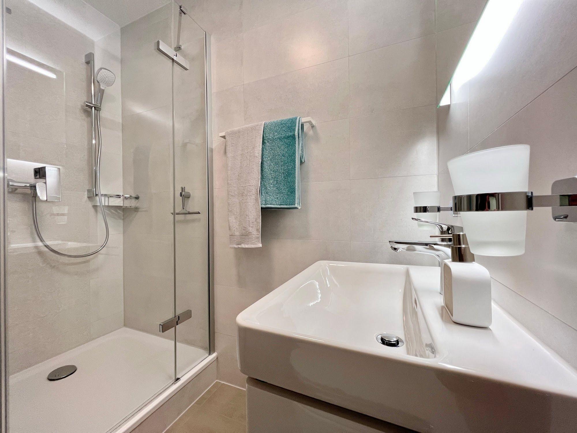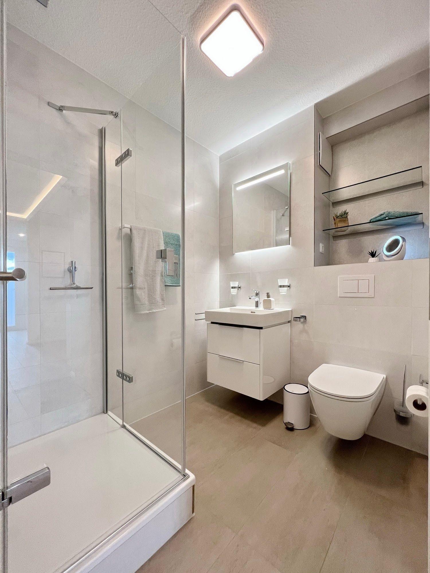 Im Badezimmer befinden sich eine Dusche, ein WC, ein Waschbecken mit Unterschrank sowie ausreichend Platz für Ihre Kosmetikartikel.