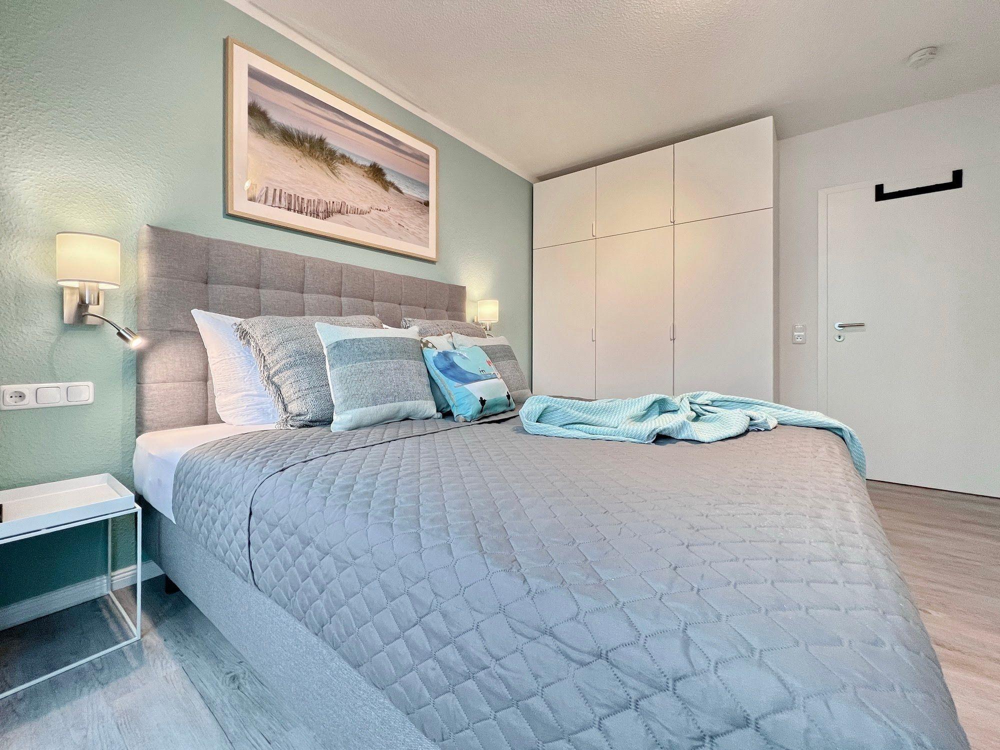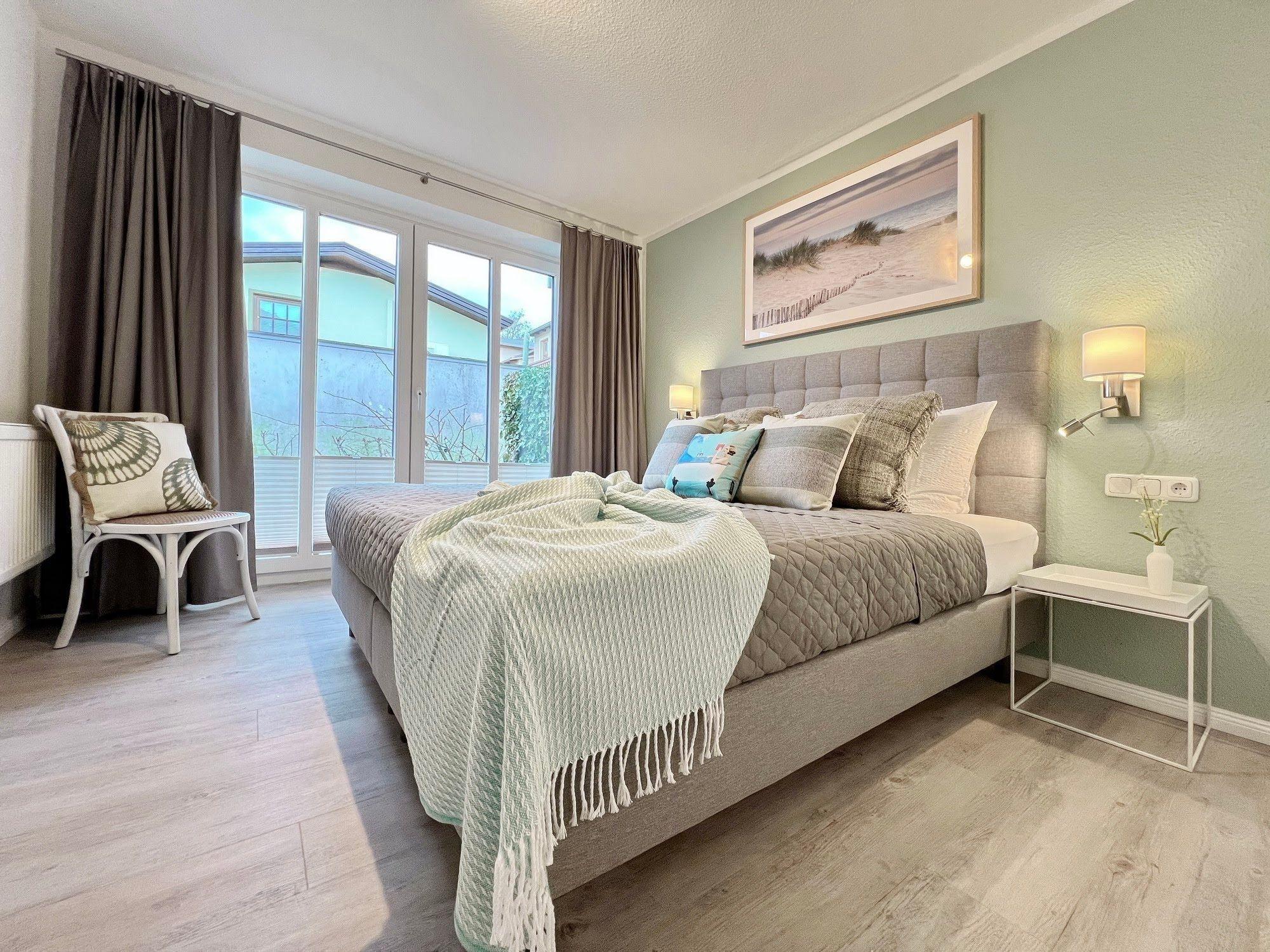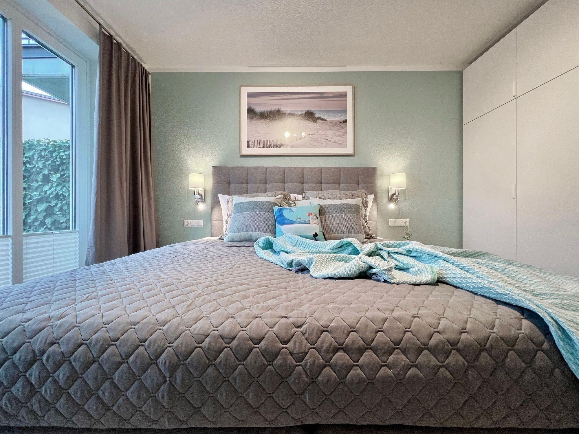 Das separate Schlafzimmer mit einem Boxspringbett garantiert einen erholsamen Schlaf und einen perfekten Start in den nächsten Urlaubstag.