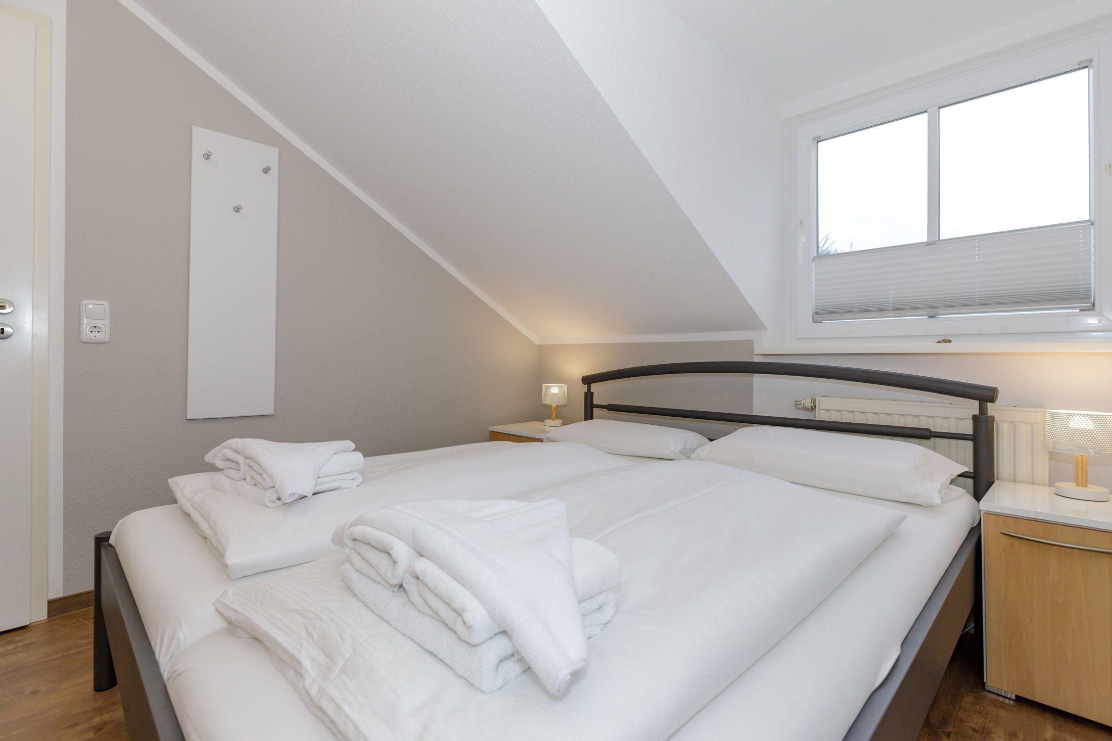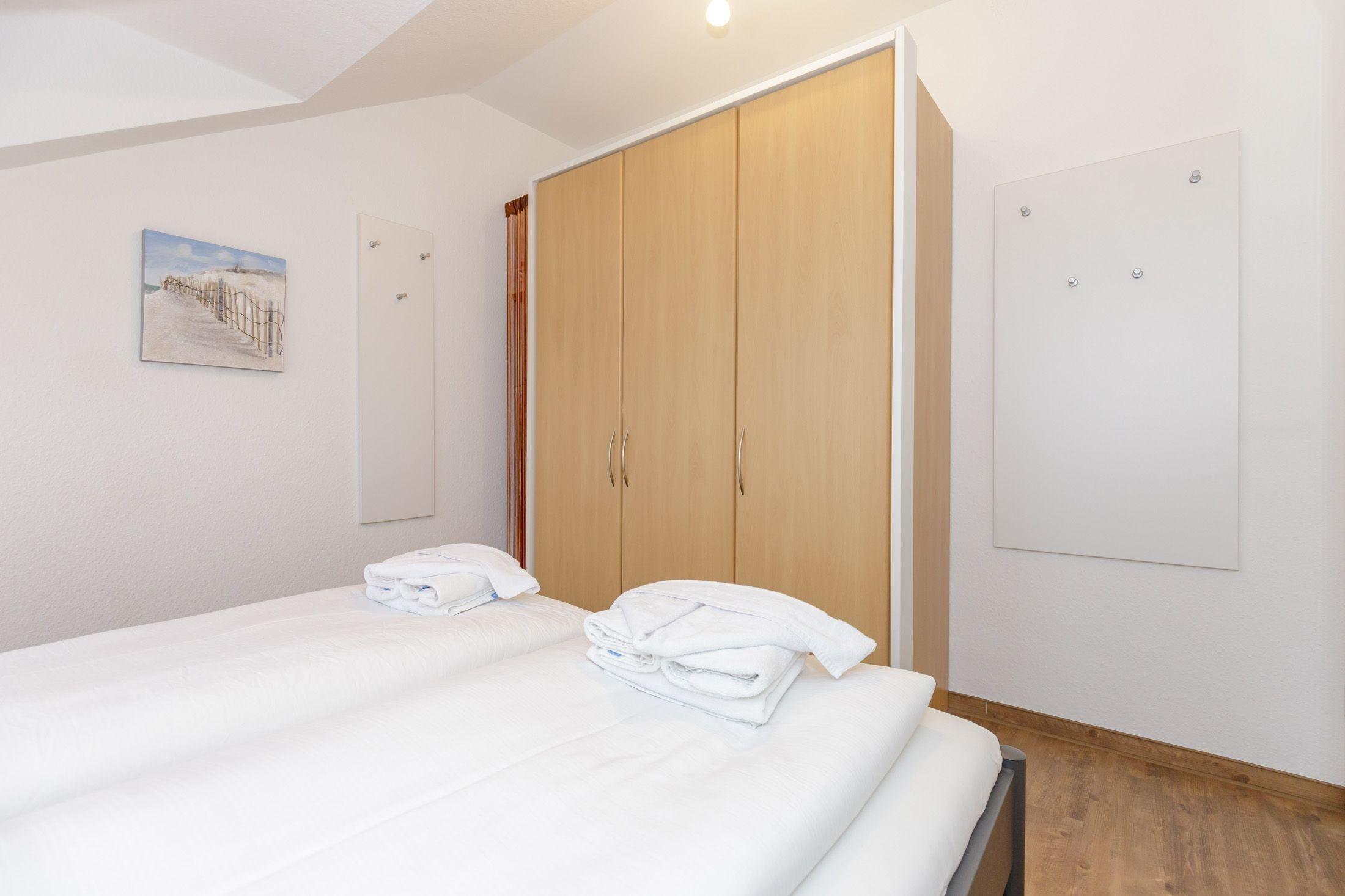 Das Schlafzimmer ist mit einem bequemen Doppelbett (1,60 m x 2,00 m) mit verstellbaren Lattenrosten und hochwertigen Kaltschaum-Matratzen ausgestattet. Ein Verdunkelungsrollo sorgt für einen ungestörten, erholsamen Schlaf. Ihre Urlaubsgarderobe findet ausreichend Stauraum im geräumigen Kleiderschrank.