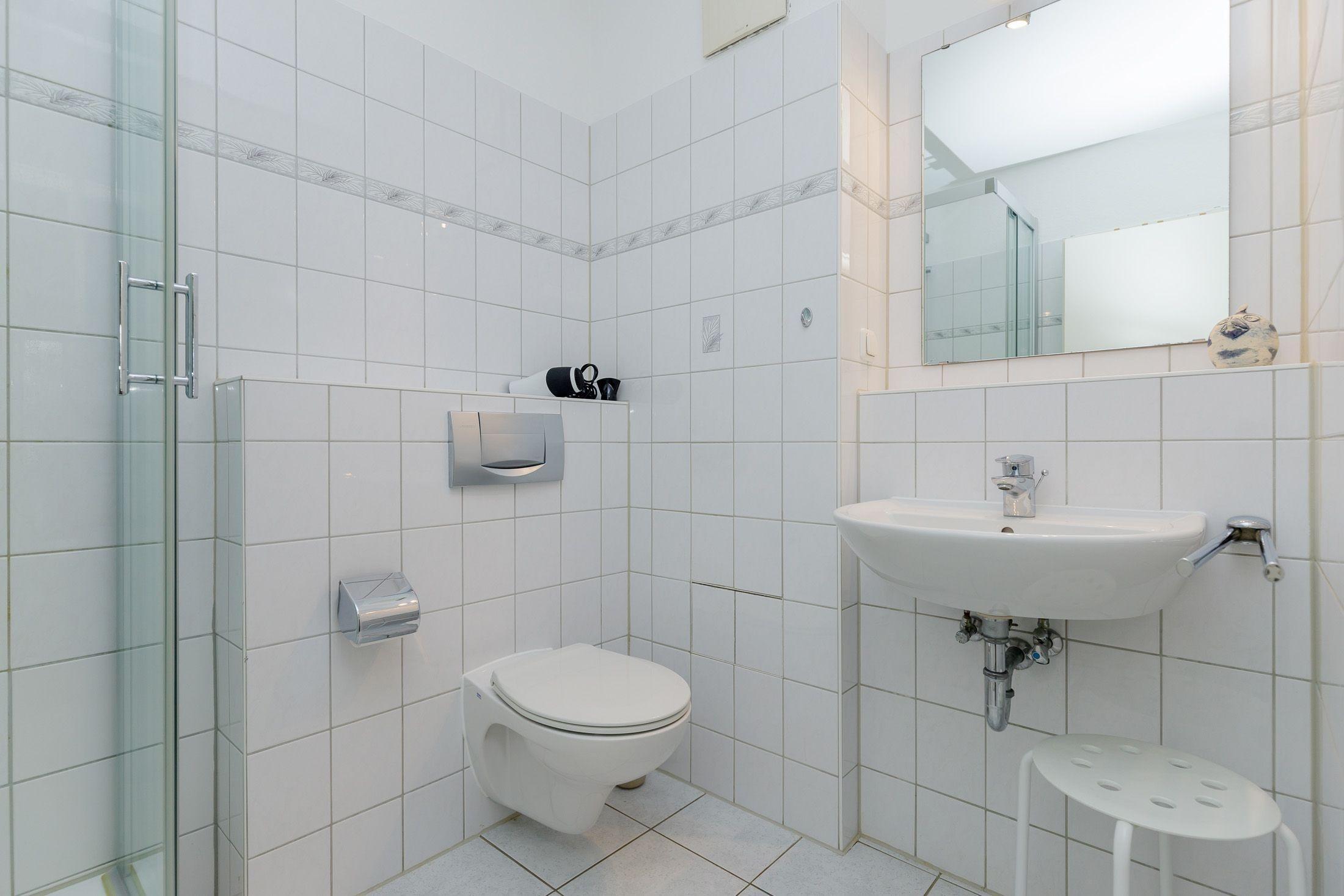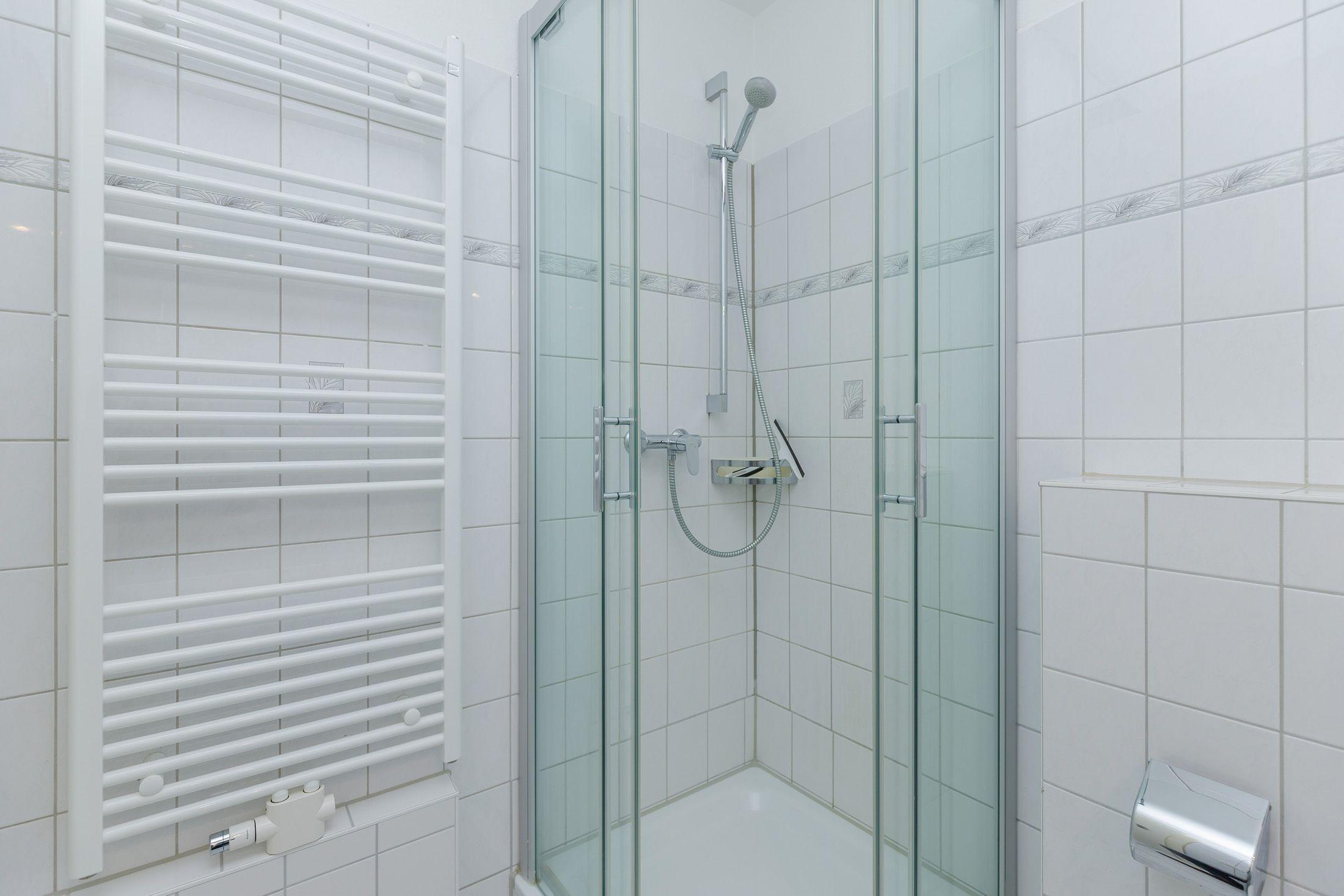 Das Badezimmer ist verfügt über eine Dusche, ein WC, ein Waschbecken sowie einen Handtuchheizkörper. Ein Föhn ist ebenfalls vorhanden.
