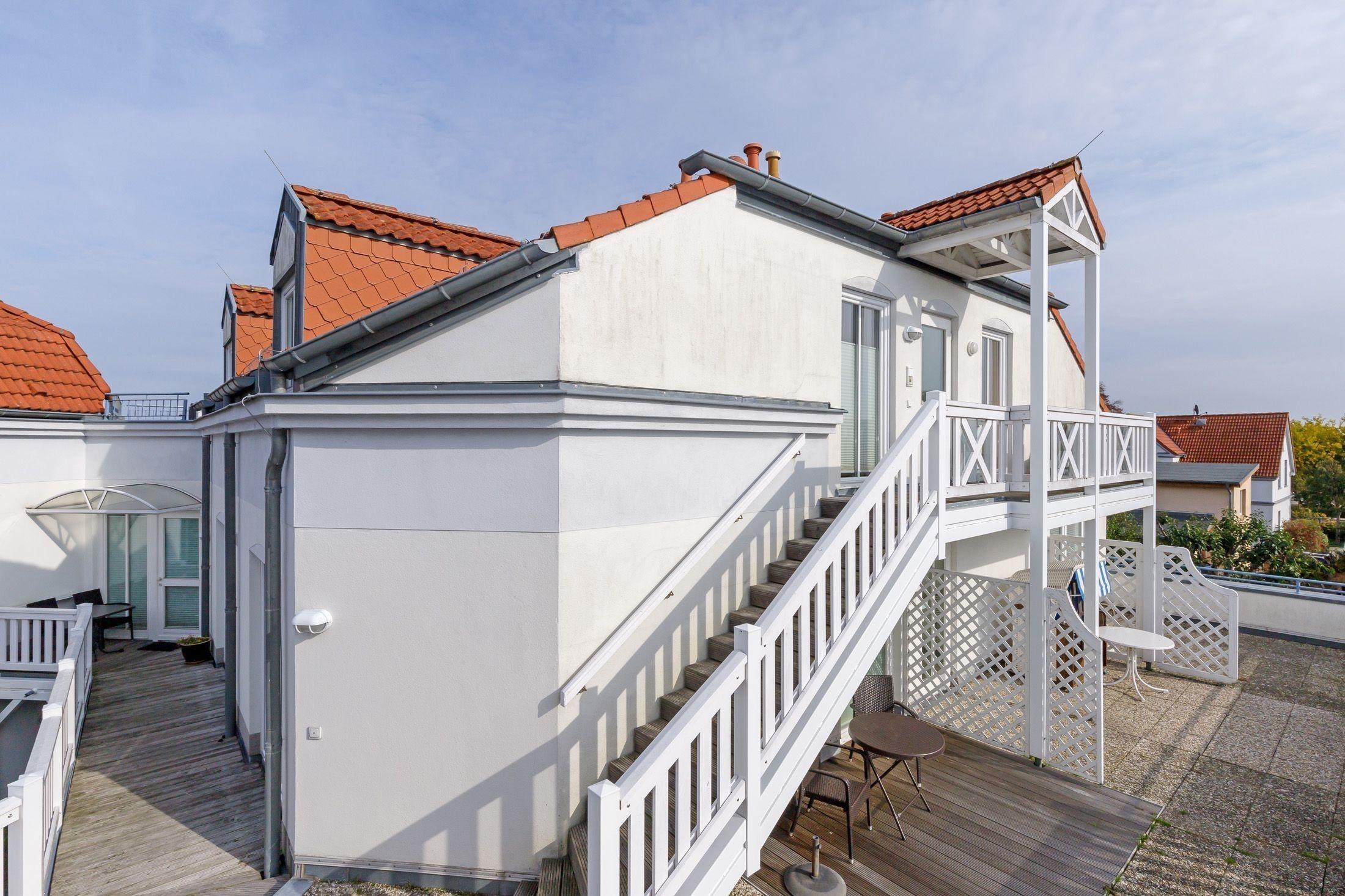 Eine ruhige Lage ist garantiert, denn die geschmackvoll eingerichtete Wohnung liegt im hinteren Teil des Hauses. Über eine Außentreppe gelangen Sie direkt zur Wohnung im 2. Obergeschoss.