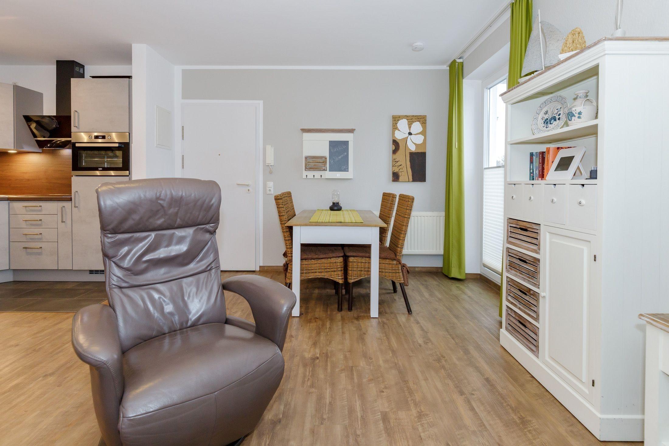 Der angrenzende Essbereich umfasst einen Esstisch mit 4 Stühlen sowie eine offene, voll ausgestattete Küche, in der Sie auf nichts verzichten müssen. Alle Geräte und Küchenutensilien, die in einer modernen Küche nicht fehlen dürfen, sind für die Zubereitung Ihrer Mahlzeiten vorhanden. Hier macht das Kochen sogar im Urlaub Spaß.