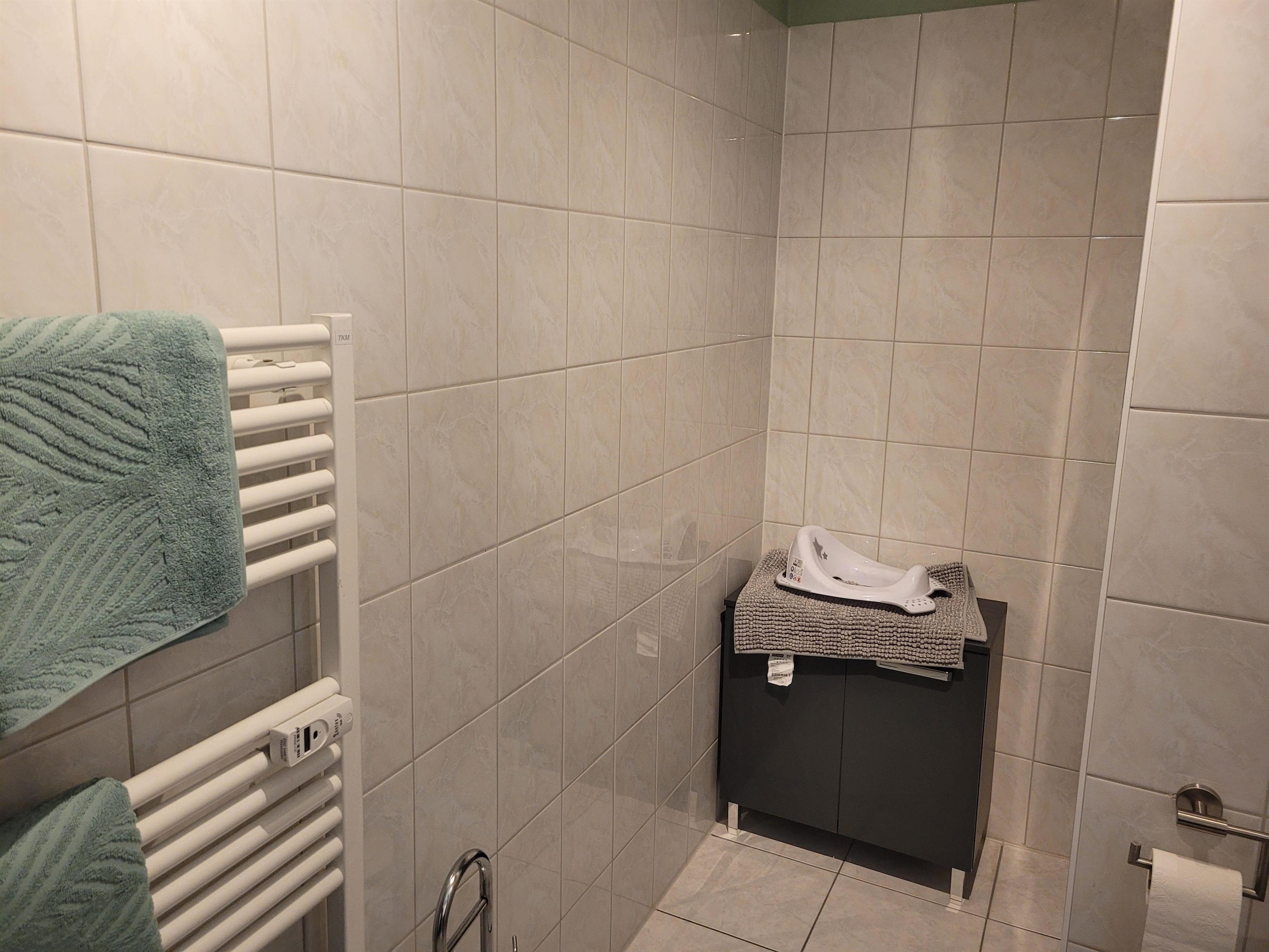 Das Badezimmer verfügt über eine Dusche, ein Waschbecken und ein WC. Auch für ausreichend Platz für Ihre Badutensilien ist gesorgt.