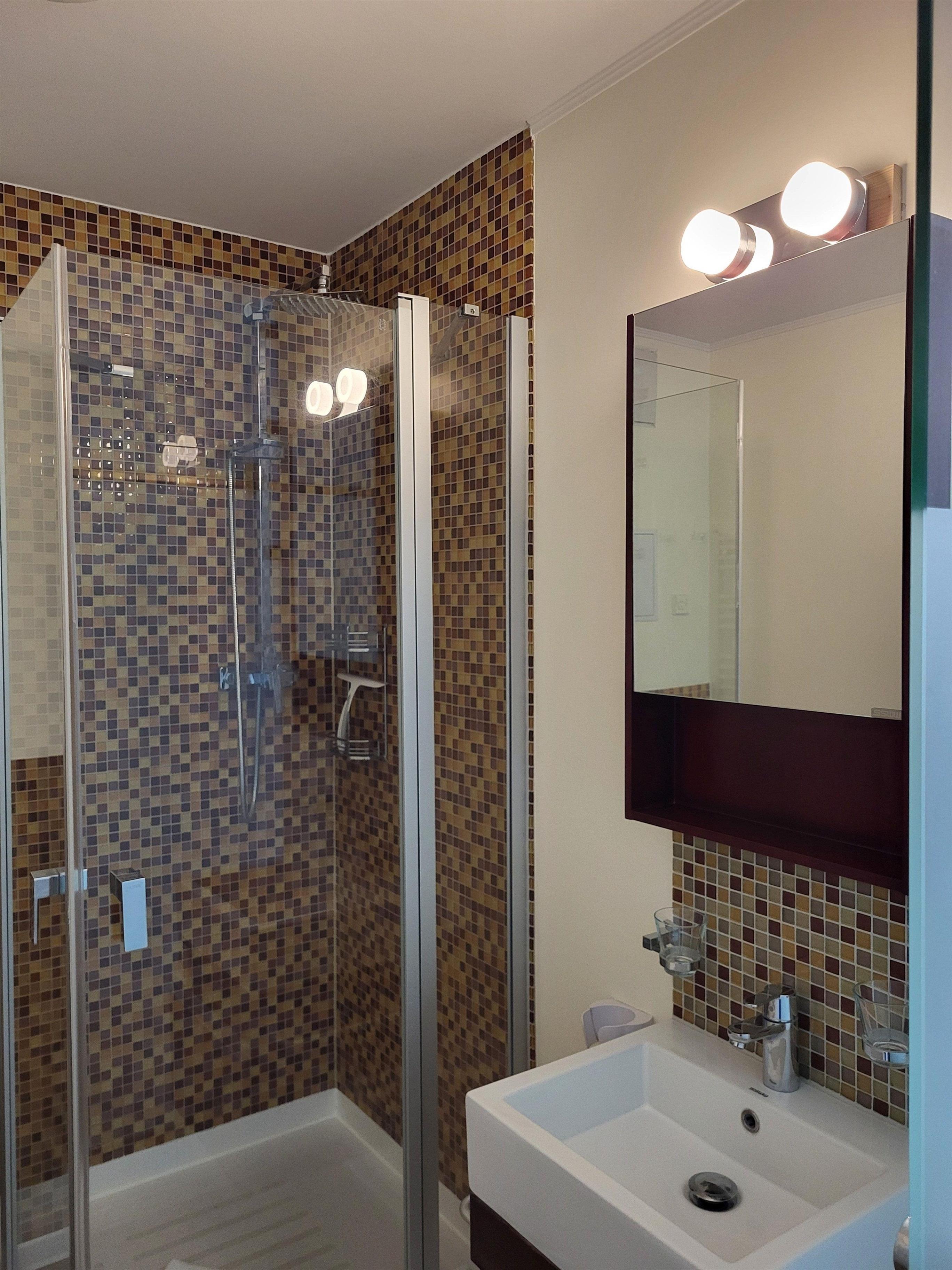 Das Badezimmer strahlt durch die Mosaikfliesen ein behagliches Ambiente aus und verfügt über eine Dusche, ein WC, ein Waschbecken mit Unterschrank und einen Föhn.