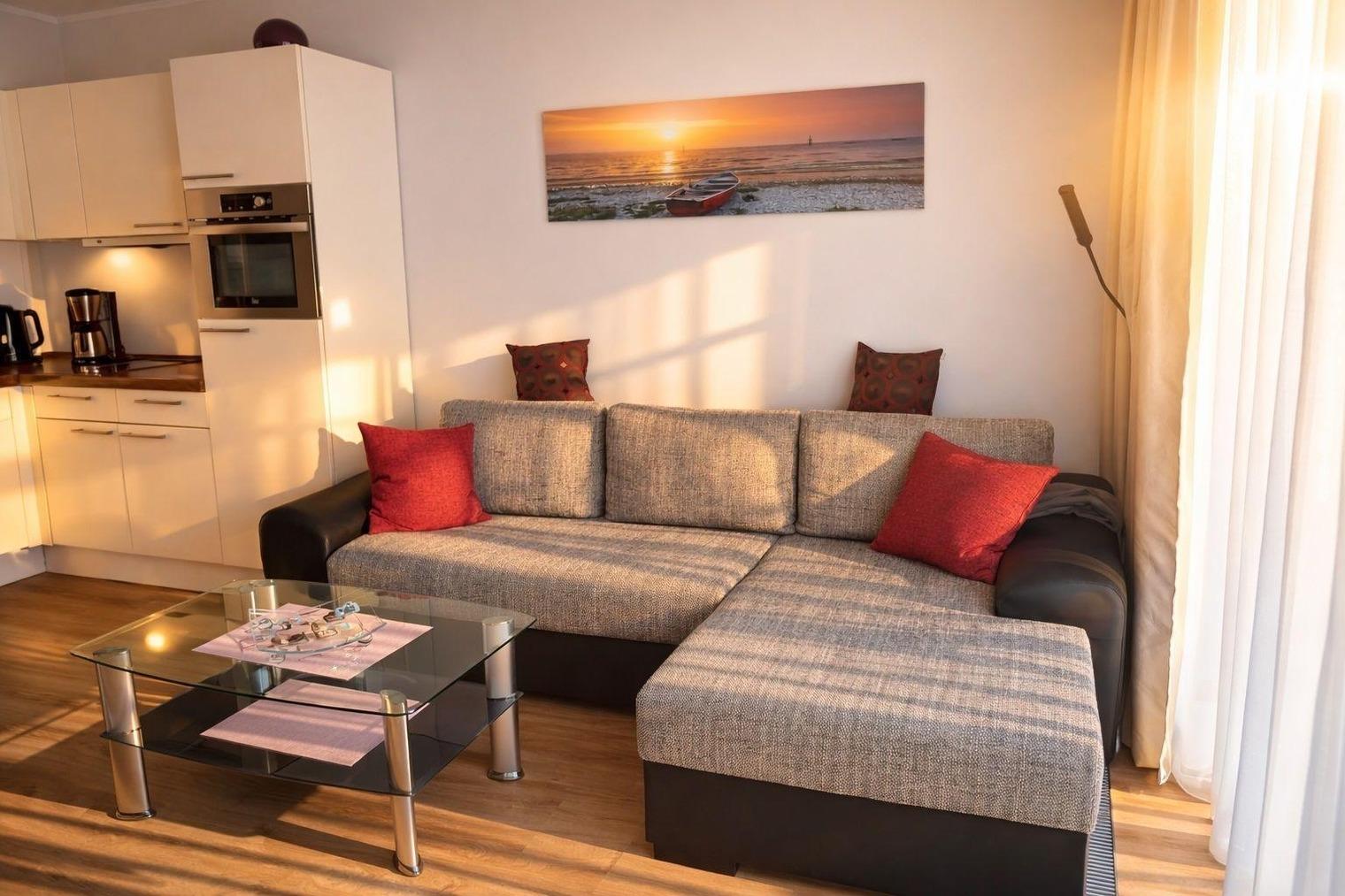 Im Wohnraum befindet sich eine gemütliche Eck-Couch sowie ein Flatscreen-TV, DVD-Player und eine Hifi-Anlage mit CD Player.