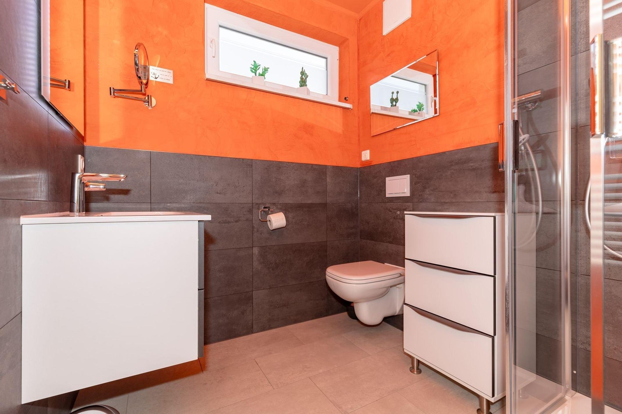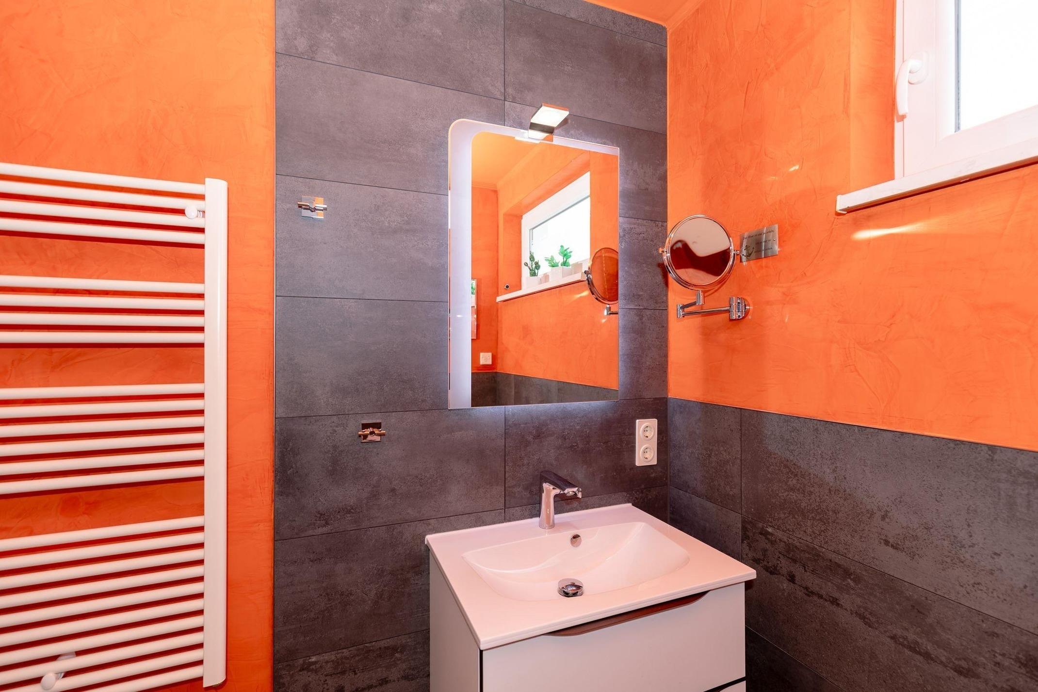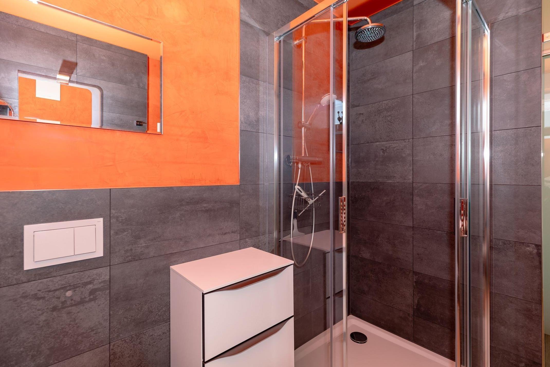 Das Badezimmer verfügt über eine moderne Dusche, ein WC und einen Waschtisch mit Unterschrank. Eine Vielzahl von Ablagemöglichkeiten für Ihre Badutensilien sind ebenso vorhanden.