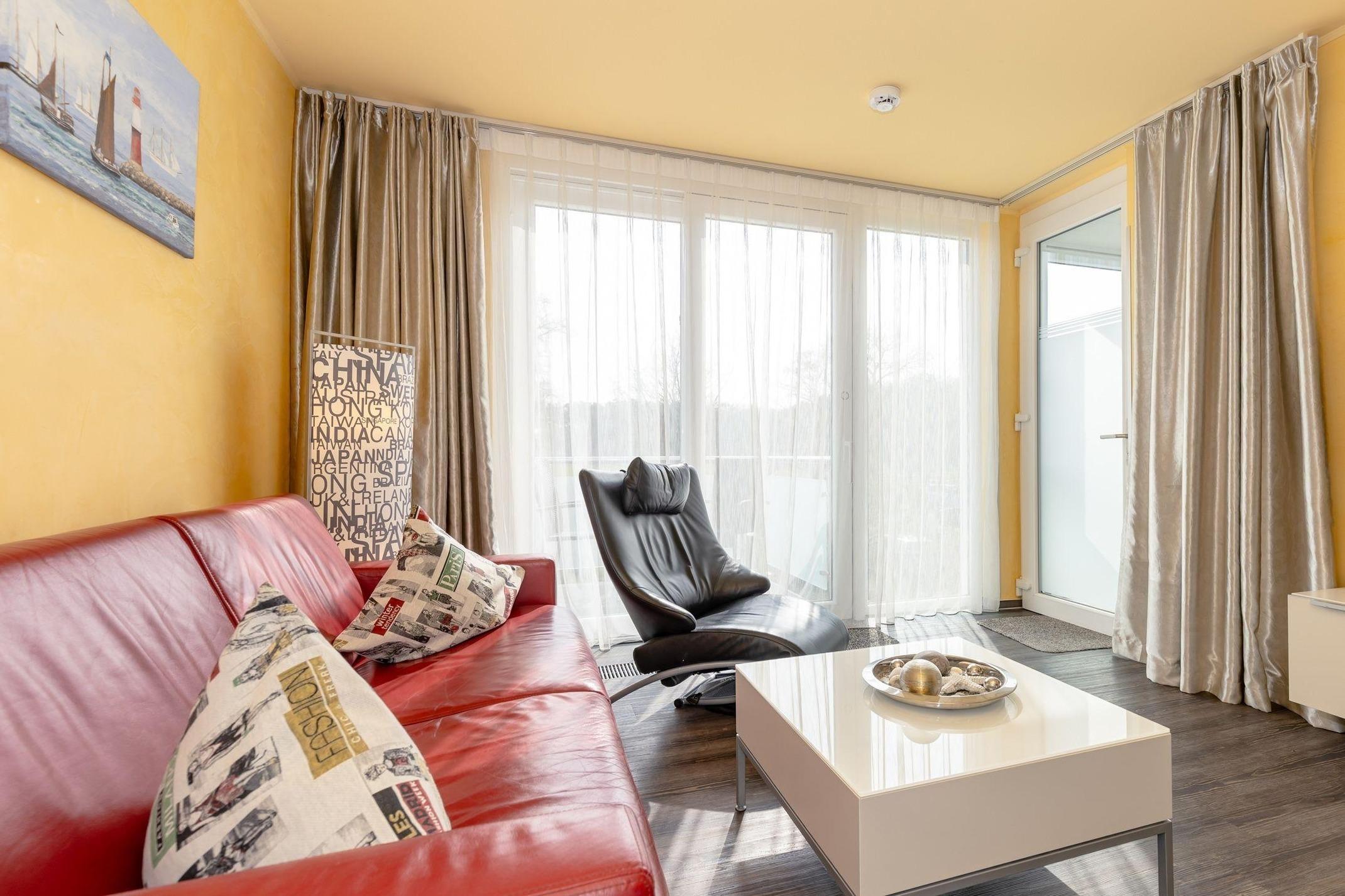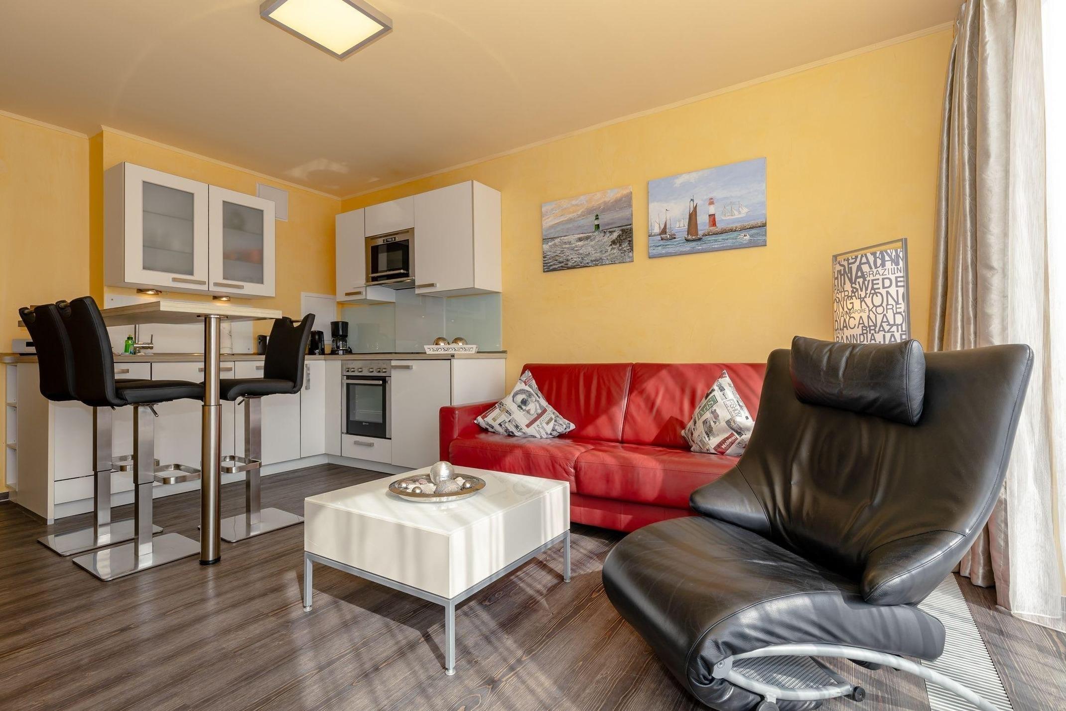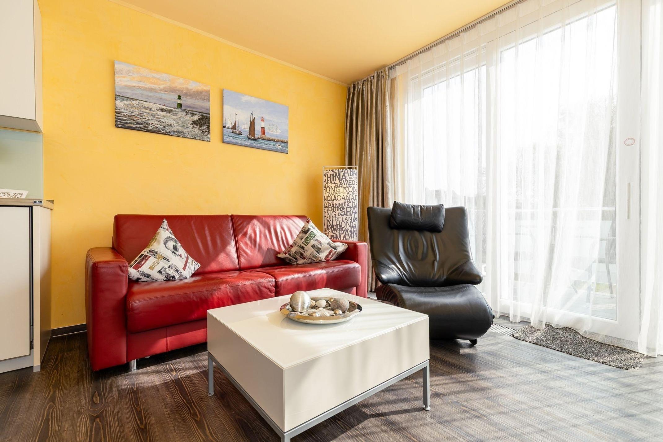 Der Wohnbereich erwartet Sie mit einem modernen roten Ledersofa, mit nur wenigen Handgriffen können Sie das Sofa zu einem Schlafplatz für eine dritte Person umfunktionieren. Auch vom bequemen Ledersessel aus können Sie das Fernsehprogramm genießen, hierfür steht Ihnen ein Flachbildschirm-Gerät zur Verfügung.