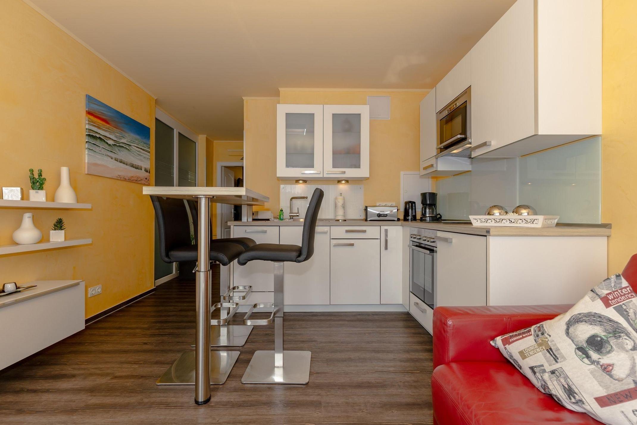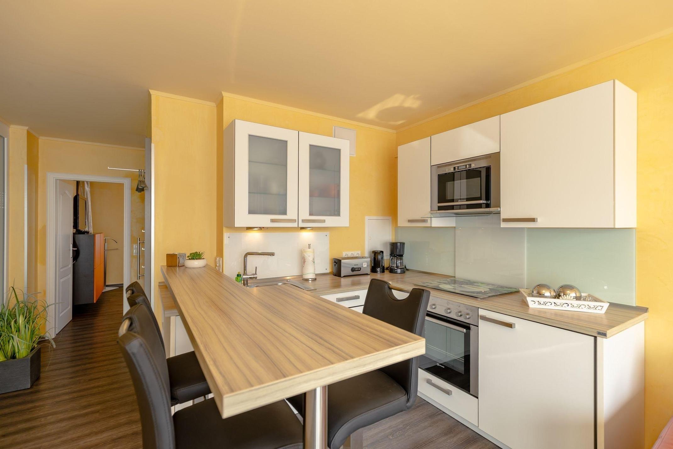 Direkt an den Wohnbereich grenzt die exklusive, voll ausgestattete Küche, die keine Wünsche offen lässt. Sie ist mit allen Geräten und Küchenutensilien eingerichtet, die in einer modernen Küche nicht fehlen dürfen. Am integrierten Esstresen können die gemeinsamen Mahlzeiten eingenommen werden.