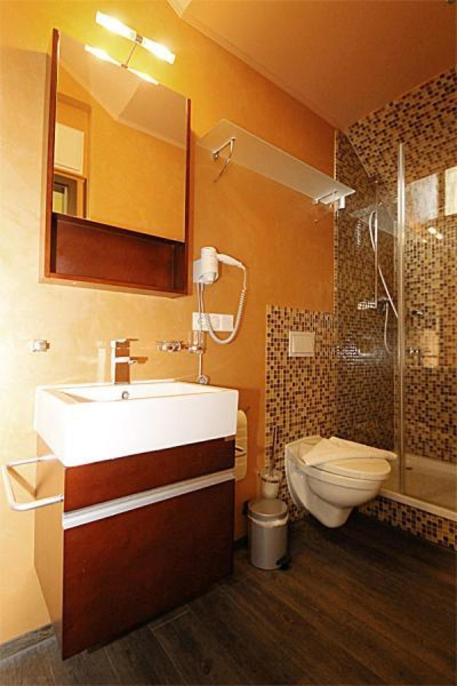 Das Badezimmer verfügt über eine Dusche, ein Waschbecken mit Unterschrank und ein WC. Auch ein Fhn ist vorhanden.