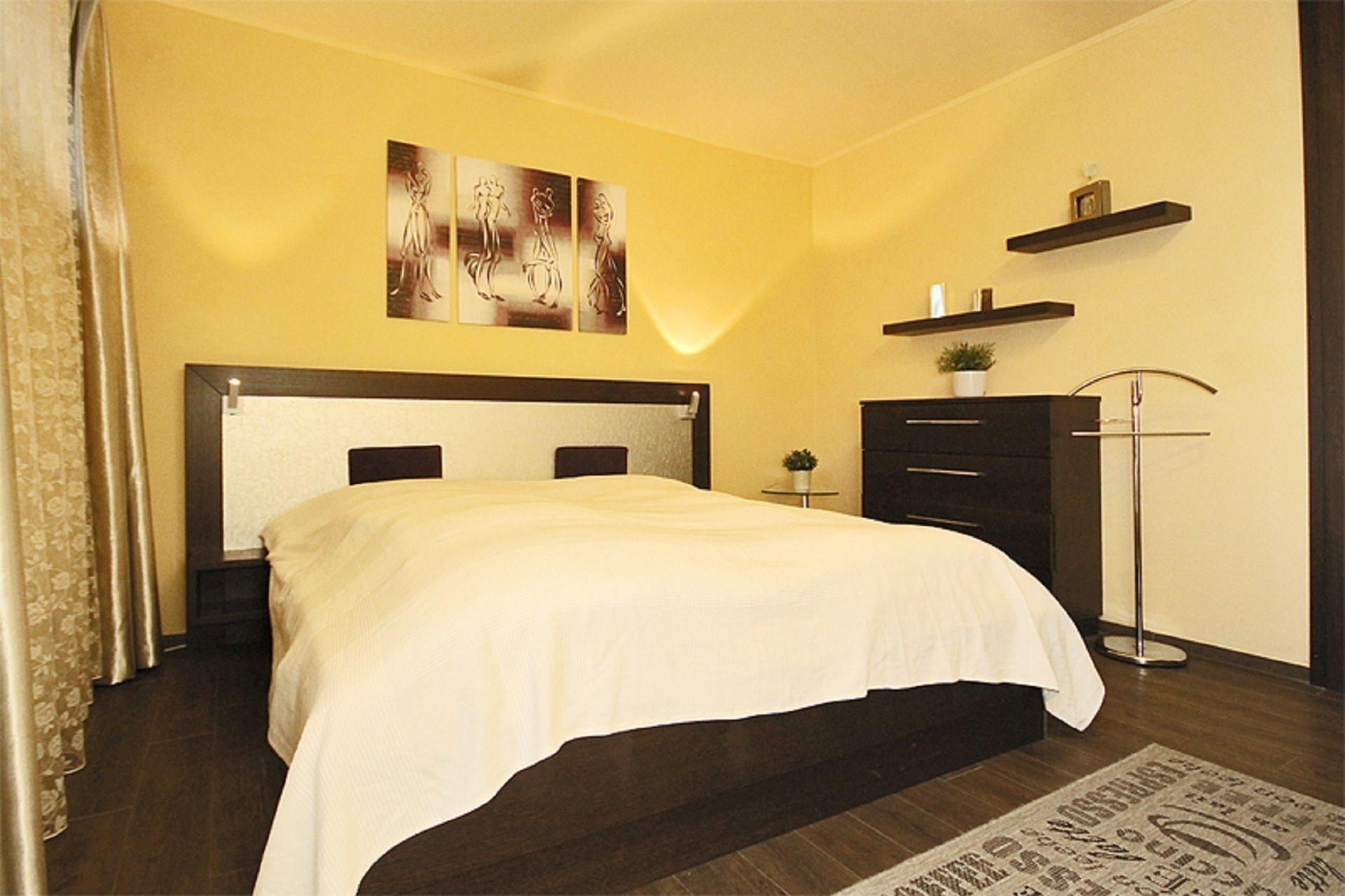 Von der Wohnungseingangstür gelangen Sie direkt ins Schlafzimmer. Es ist mit einem komfortablen Doppelbett und einer Kommode ausgestattet. Zur Verdunklung sind Übergardinen vor den großen Fenstern angebracht.