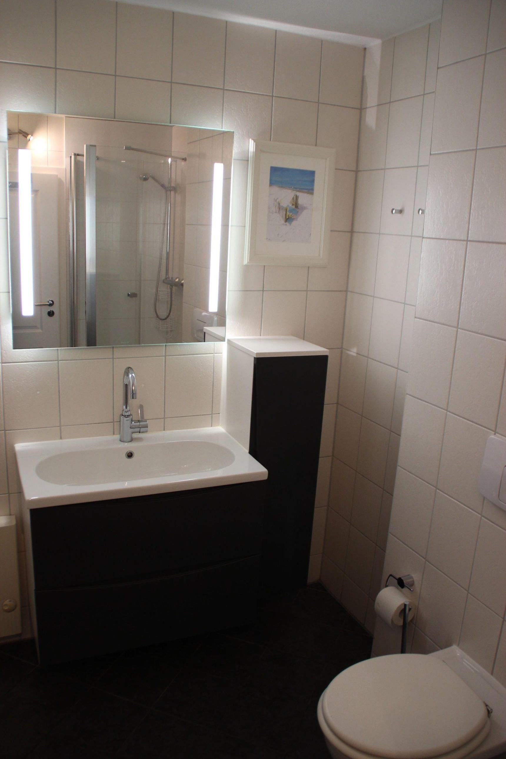 Das mit einem Fenster versehene Bad verfügt über eine Dusche, ein Waschbecken mit Unterschrank sowie einen Spiegelschrank für Ihre Badutensilien, ein WC sowie einen Handtuchheizkörper. Auch auf einen Föhn und einen Kindertritt müssen Sie nicht verzichten.