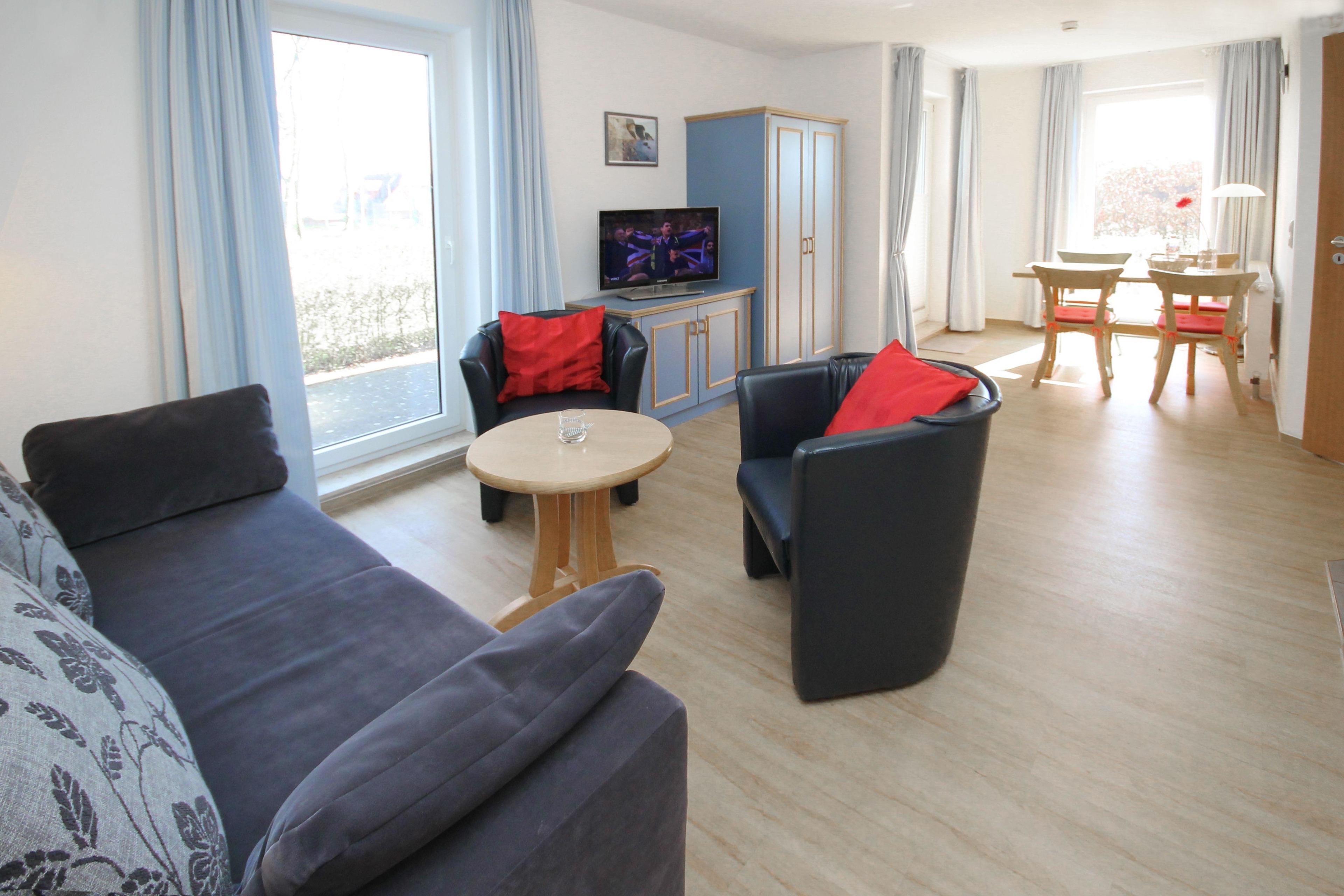 Der komfortable Wohnbereich ist mit einer Sofa- und Sesselecke eingerichtet. Hier können Sie sich nach einem ereignisreichen Tag wunderbar erholen.