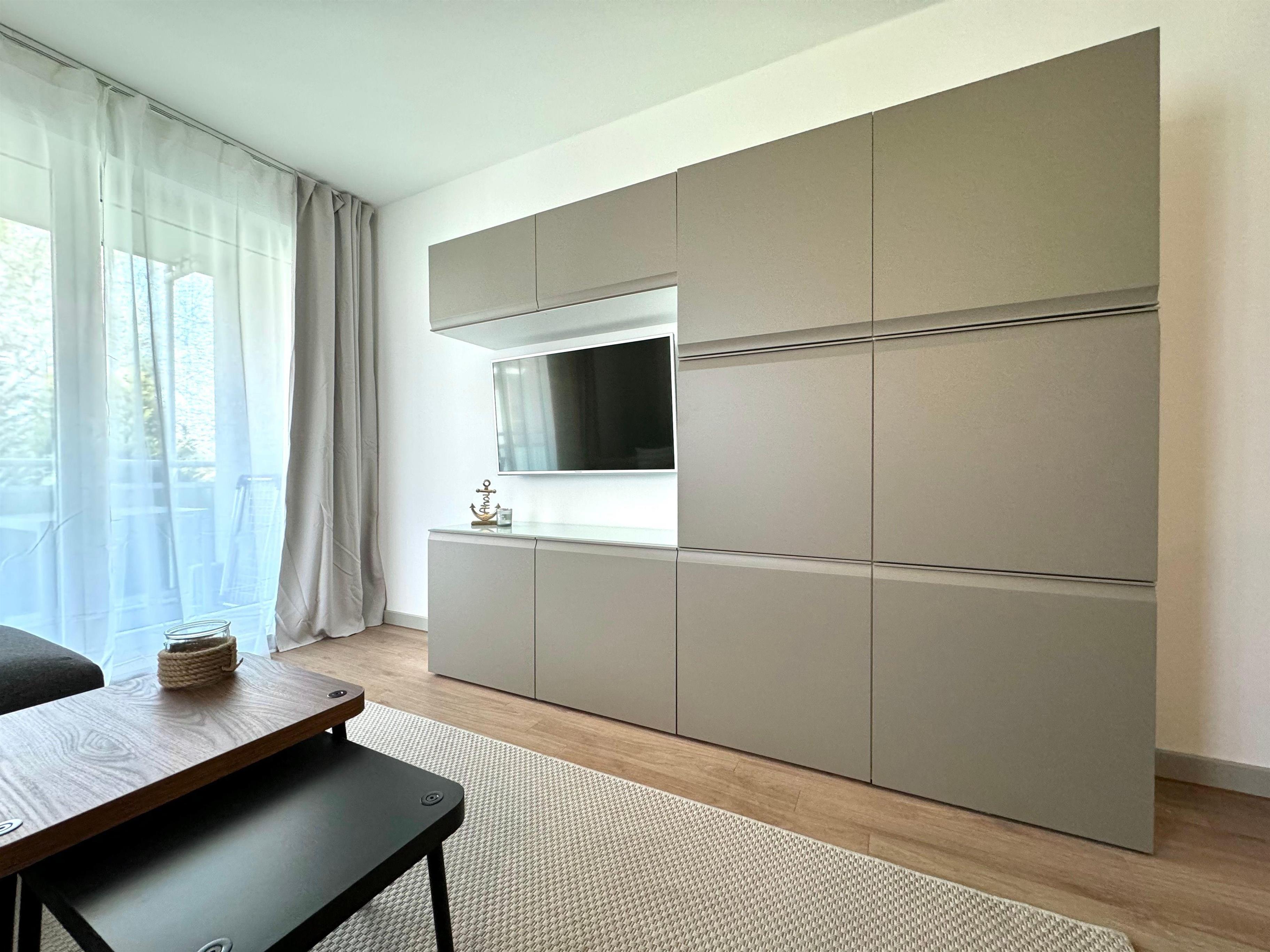 Im Wohnbereich bietet eine behagliche Couch, die mit wenigen Handgriffen zum Schlafsofa (1,40m Breite) umgebaut werden kann. Daneben gibt es reichlich Verstauungsmöglichkeiten in der Schrankwand sowie einen Fernseher.