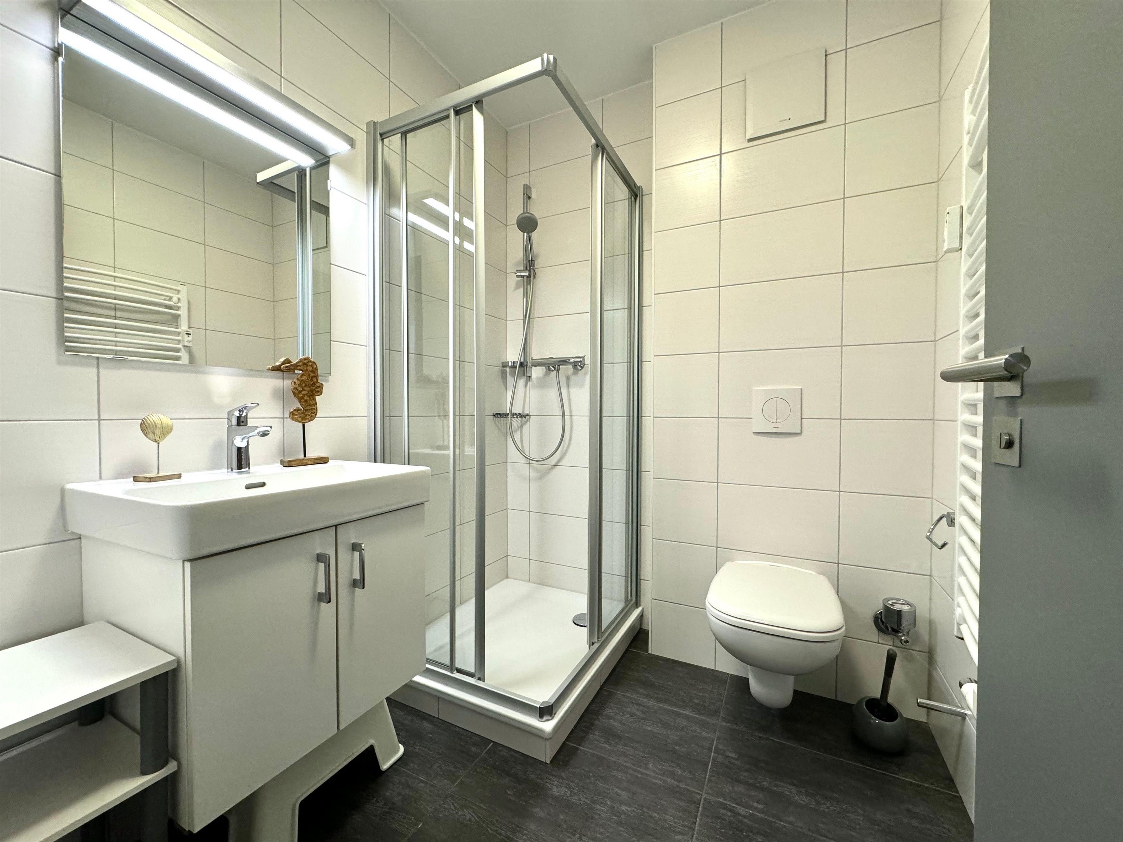 Das Badezimmer ist mit einer Echtglas-Dusche mit niedrigem Einstieg, Waschtisch, Handtuchheizkörper und natürlich WC ausgestattet.