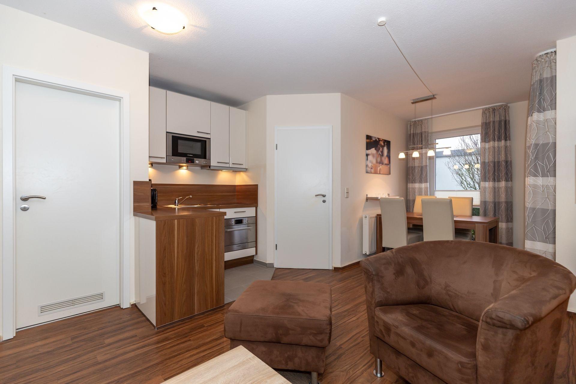 An Ihre Wohnung grenzt eine windgeschützte Terrasse zur Südseite, die Sie direkt von Ihrem Wohnzimmer aus betreten können. Die bequemen Möbel laden zum Sonnenbaden ein, und am Abend können Sie in diesem gemütlichen Ambiente einen ereignisreichen Tag bei einem leckeren Getränk langsam ausklingen lassen. So sind Sie gewappnet für einen weiteren erlebnisreichen Tag.