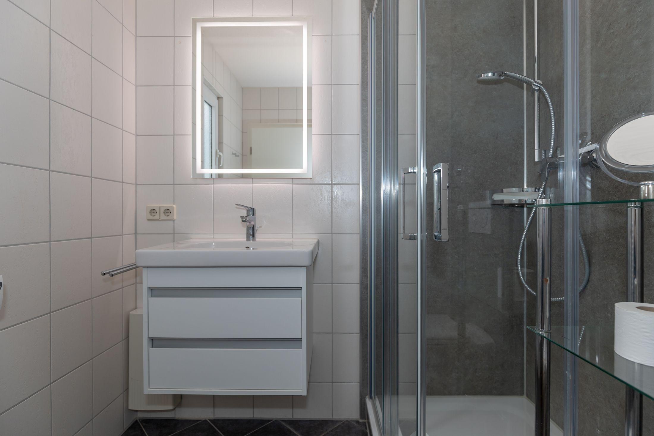 Das Badezimmer ist mit einer Dusche, einem Waschbecken mit Unterschrank für Ihre Badutensilien sowieein WC ausgestattet.