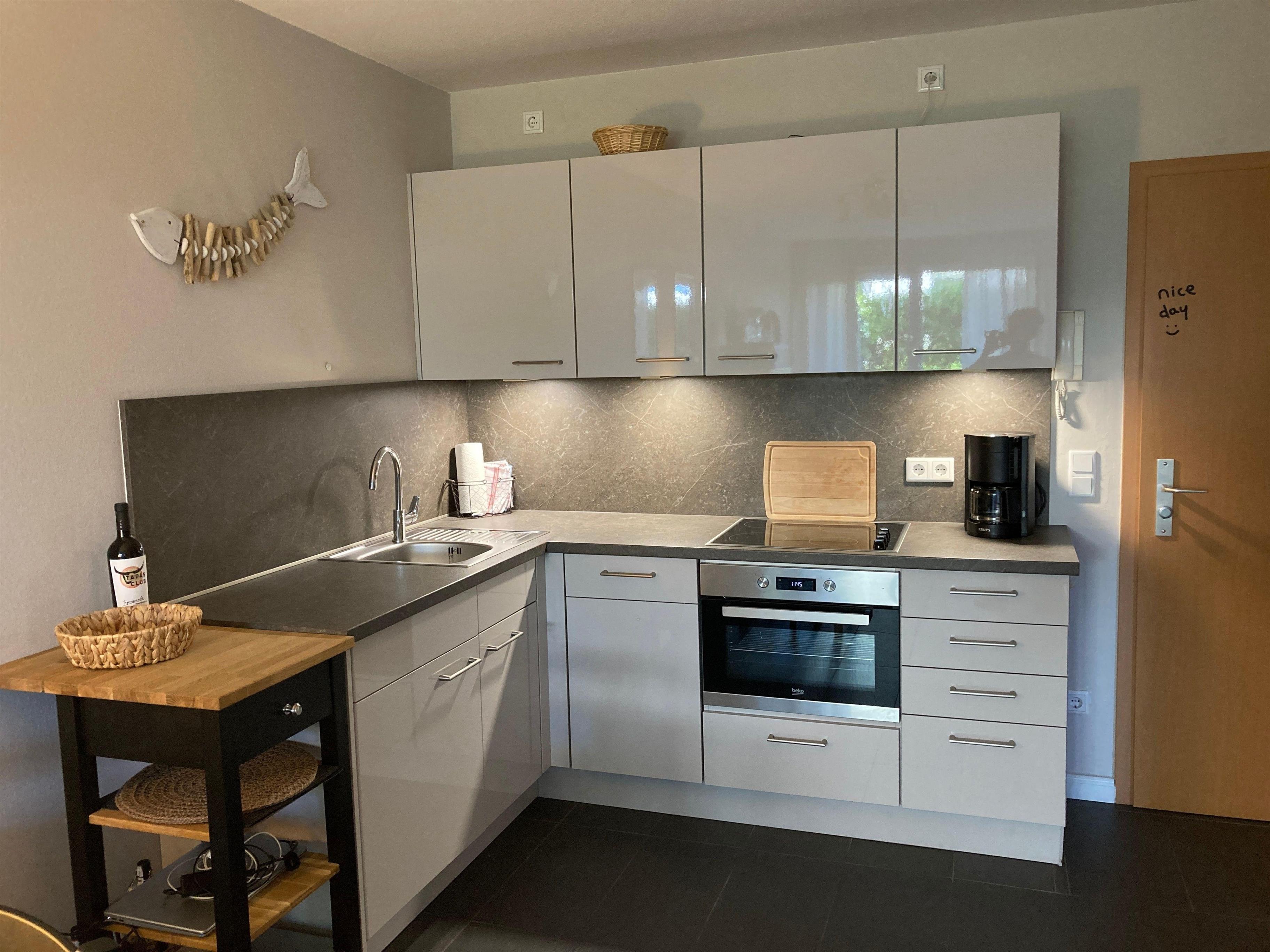 An den Wohnbereich grenzt die voll ausgestattete Küchenzeile, hier finden Sie alle Bequemlichkeiten einer modernen Küche. Schnell können Sie hier Ihre Lieblingsmahlzeiten zaubern, die Sie gemeinsam am großen Esstisch einnehmen können.