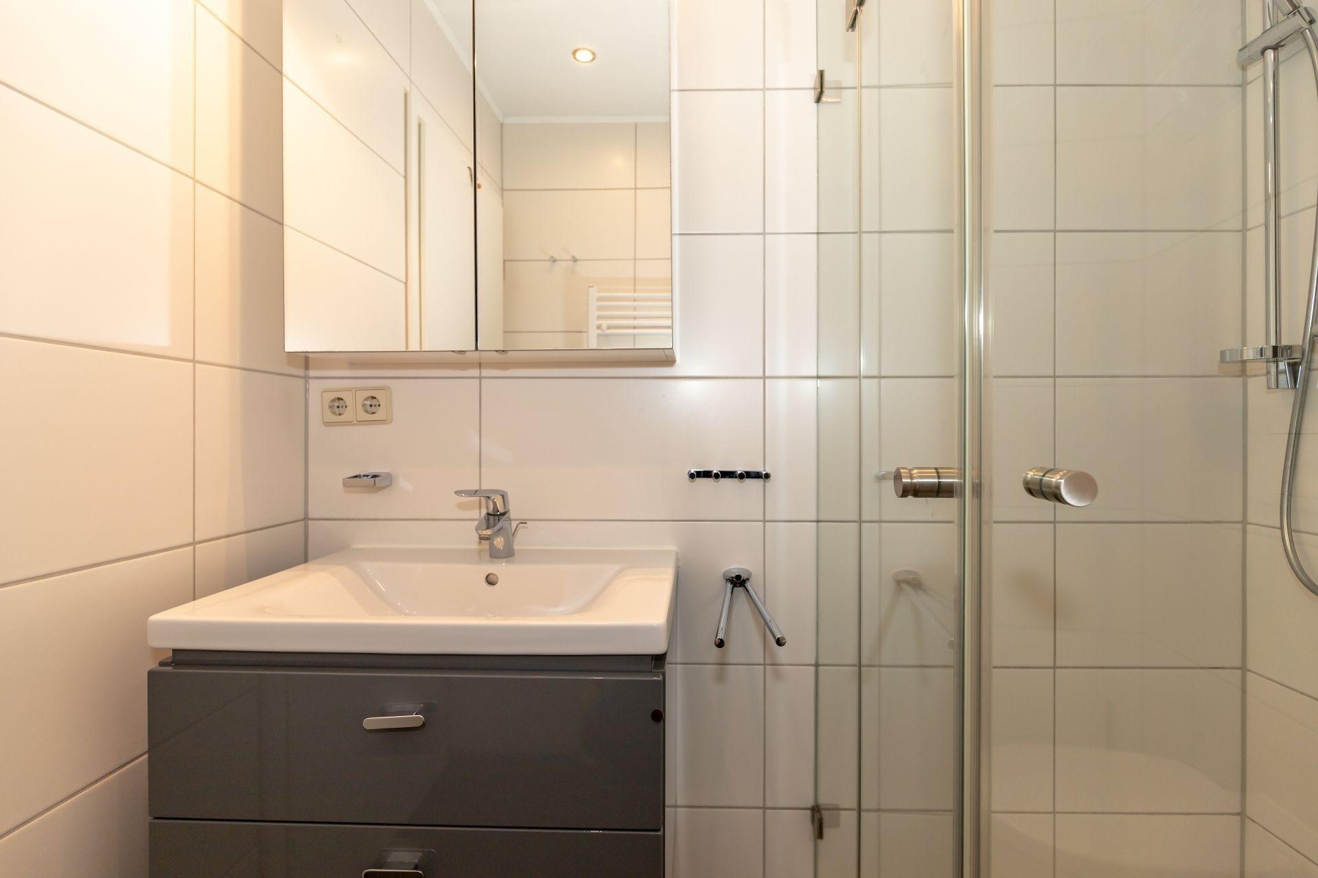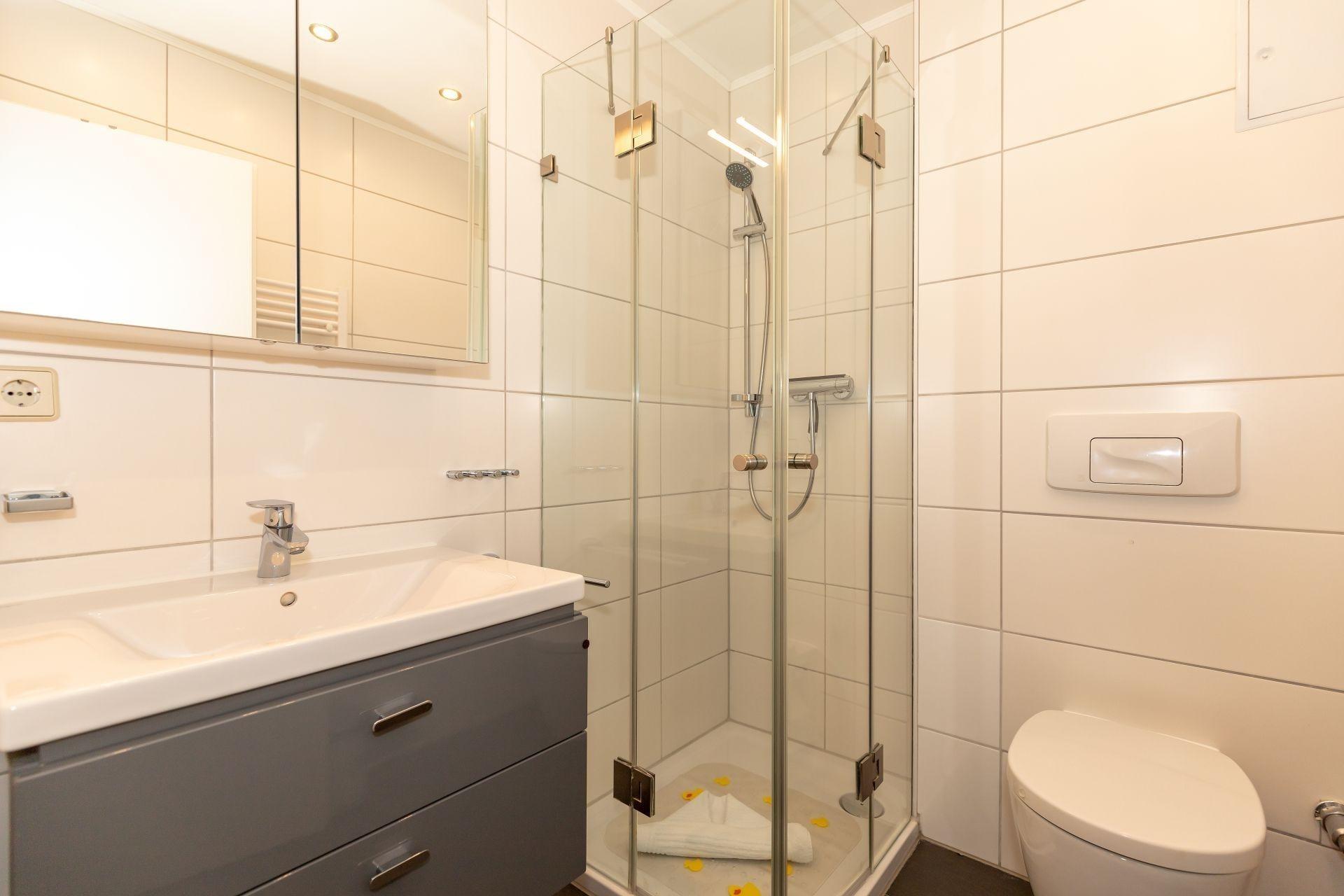 In unserem neu gefliesten Duschbad befindet sich ein Waschtisch mit Unterschrank (2 Schubladen), ein Spiegelschrank, Handtuchheizung, WC und ein Föhn. Die Dusche verfügt über einen niedrigen Einstieg.