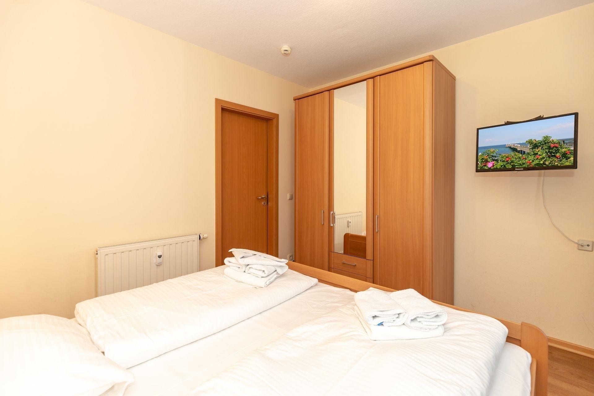 Ein zusätzlicher Fernseher im Schlafzimmer rundet die Gemütlichkeit in diesem Bereich ab.