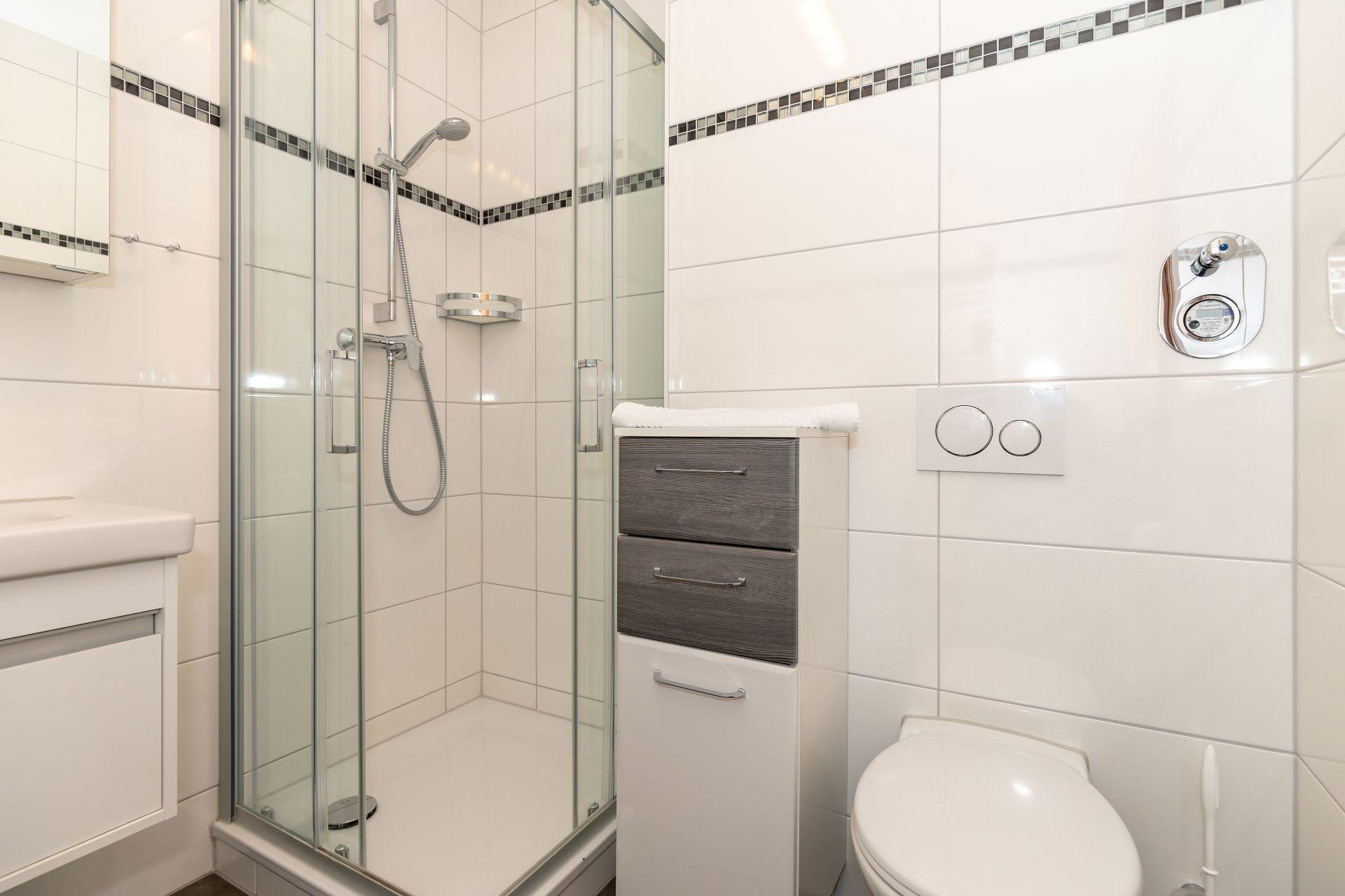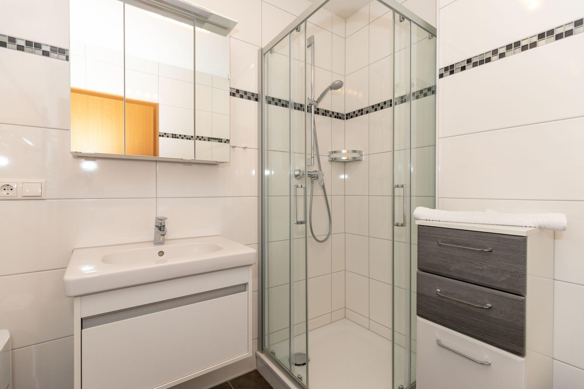 Das Badezimmer ist mit einer Dusche, einem Waschbecken mit Unterschrank und einem WC ausgestattet und verfügt über genügend Ablagefläche.
