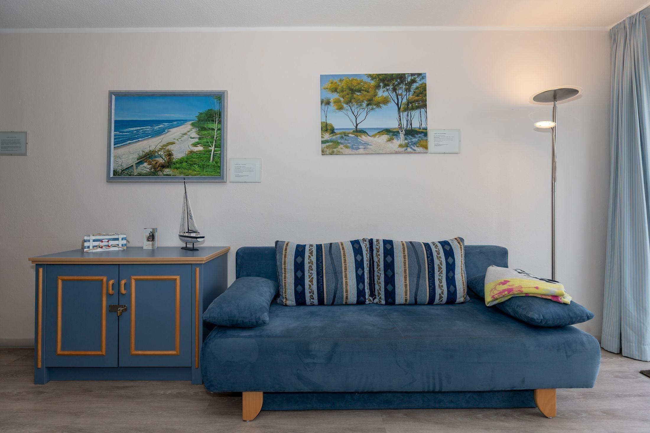 Wohnzimmer und Schlafzimmer sind mit maritimen Ölgemälden ausgestattet, die das Ostsee-Feeling in das Apartment übertragen.