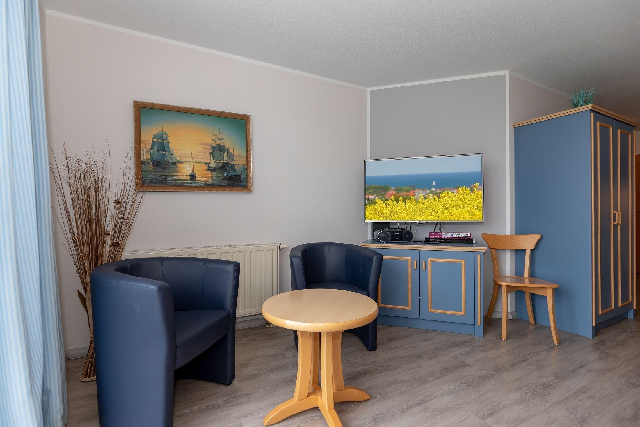 Der ansprechende Wohnbereich ist mit einer Sofa- und Sesselecke eingerichtet. Gemütlichkeit und Entspannung nach einem ereignisreichen Tag sind hier garantiert. Zusätzlich können Sie den imposanten Ausblick auf die Ostsee und die Westseite des Yachthafens genießen. Für Ihre abendliche Unterhaltung sorgt ein Flachbildschirm-TV.