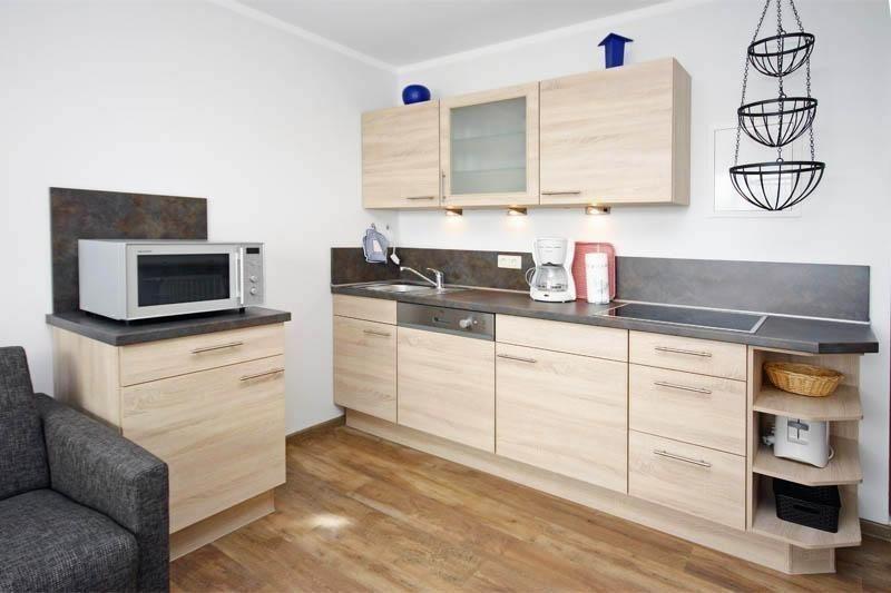 An den Wohnbereich grenzt die voll ausgestattete Küchenzeile. Hier erwarten Sie alle Bequemlichkeiten einer modernen Küche, schnell sind Ihre Lieblingsmahlzeiten zubereitet. Die Mikrowelle ist aufgrund der Größe und Funktion "pizzageeignet"!