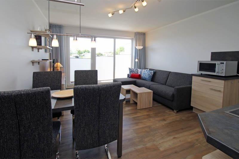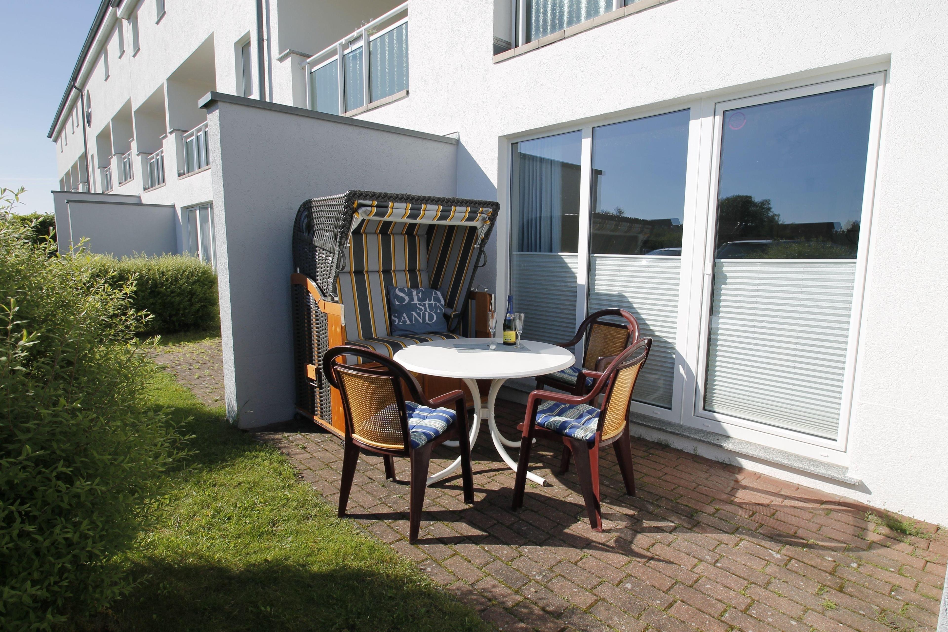 Das Apartment verfügt über eine nach Süden ausgerichtete, windgeschützte Terrasse. Hier können Sie die Seele baumeln lassen, die Sonne genießen und am Abend einen ereignisreichen Tag gemütlich ausklingen lassen. Dafür stehen hübsche Gartenmöbel bereit. Für das besondere maritime Ambiente sorgt ein Doppelsitzer-Strandkorb. Ostsee-Feeling pur!
