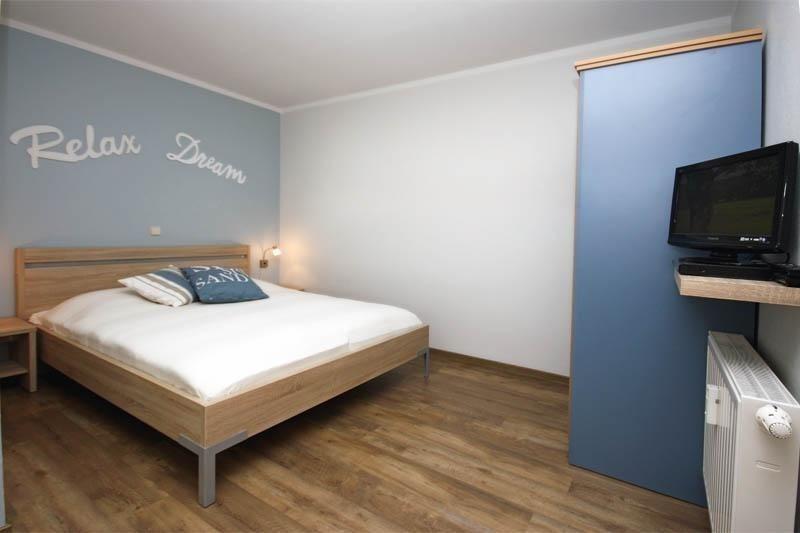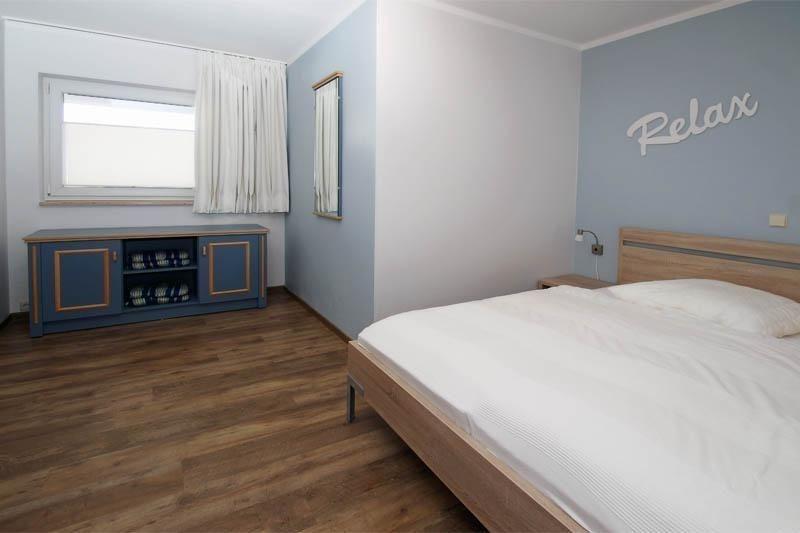Das separate Schlafzimmer ist mit einem komfortablen Doppelbett eingerichtet. Für Ihre Urlaubsgarderobe steht Ihnen hier ein geräumiger Kleiderschrank und ein Sideboard zur Verfügung. Es ist auch noch genügend Platz für ein Babybett vorhanden.