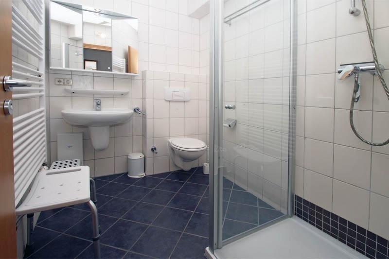 Das Badezimmer ist mit einer Dusche (großer Zugang und niedriger Einstieg), einem Handtuchheizkörper und einem WC ausgestattet.
