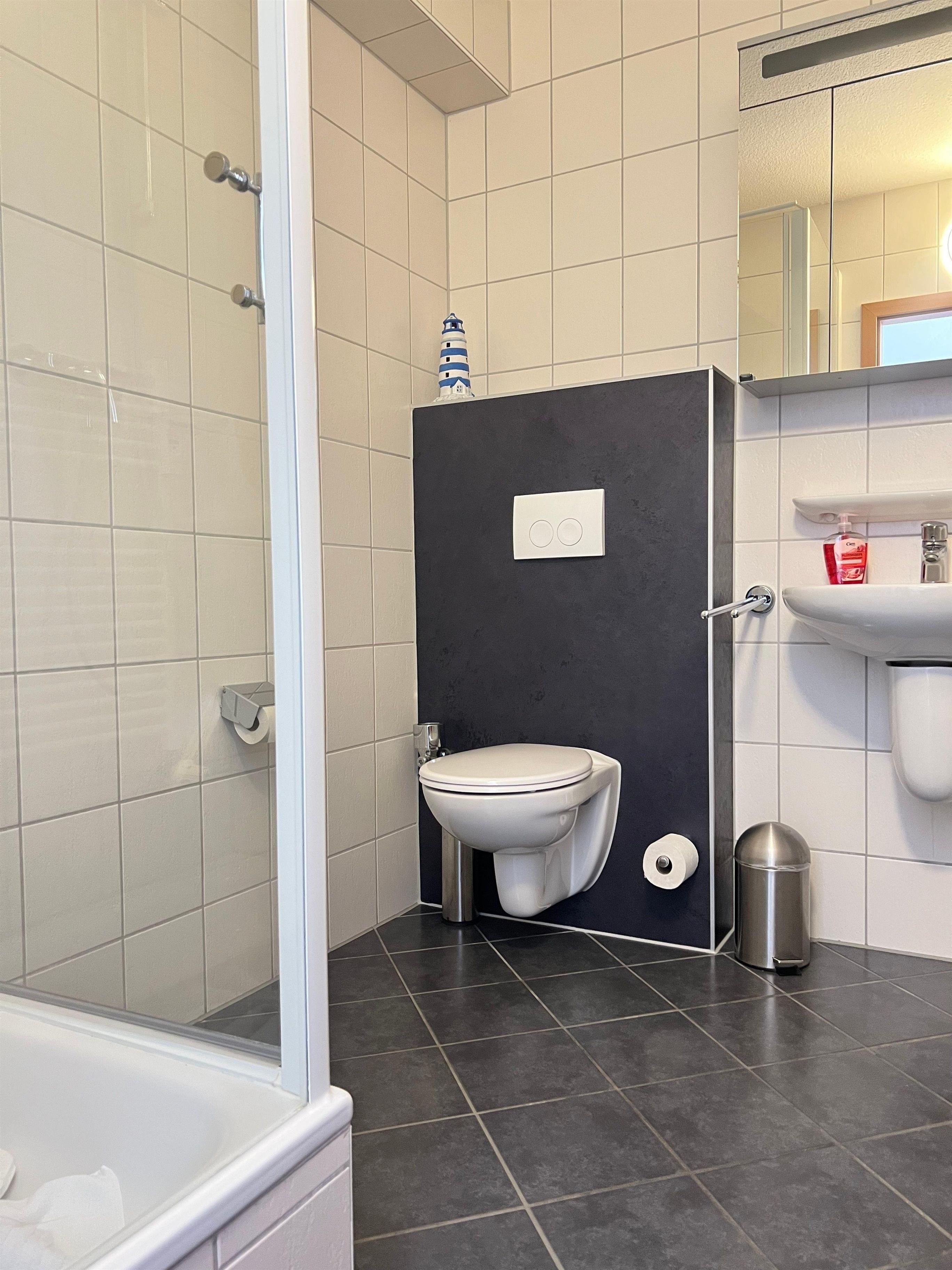 Das Badezimmer verfügt über eine Dusche, ein Waschbecken und ein WC.