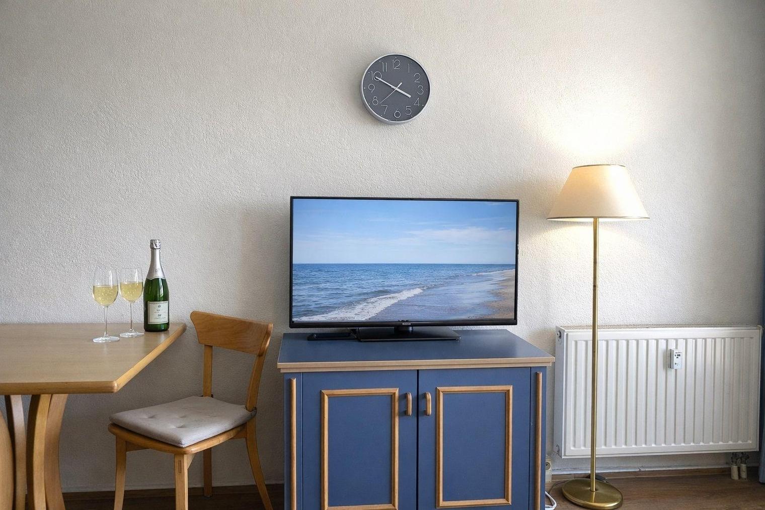 Der kleine Wohn-/Schlafbereich ist mit einem großen, bequemen Doppelbett und einer kleinen Essecke eingerichtet. In dieser kleinen Wohlfühloase können Sie Ihre Urlaubstage in vollen Zügen genießen. Für Ihre abendliche Unterhaltung sorgt ein Flachbildschirm-Gerät.