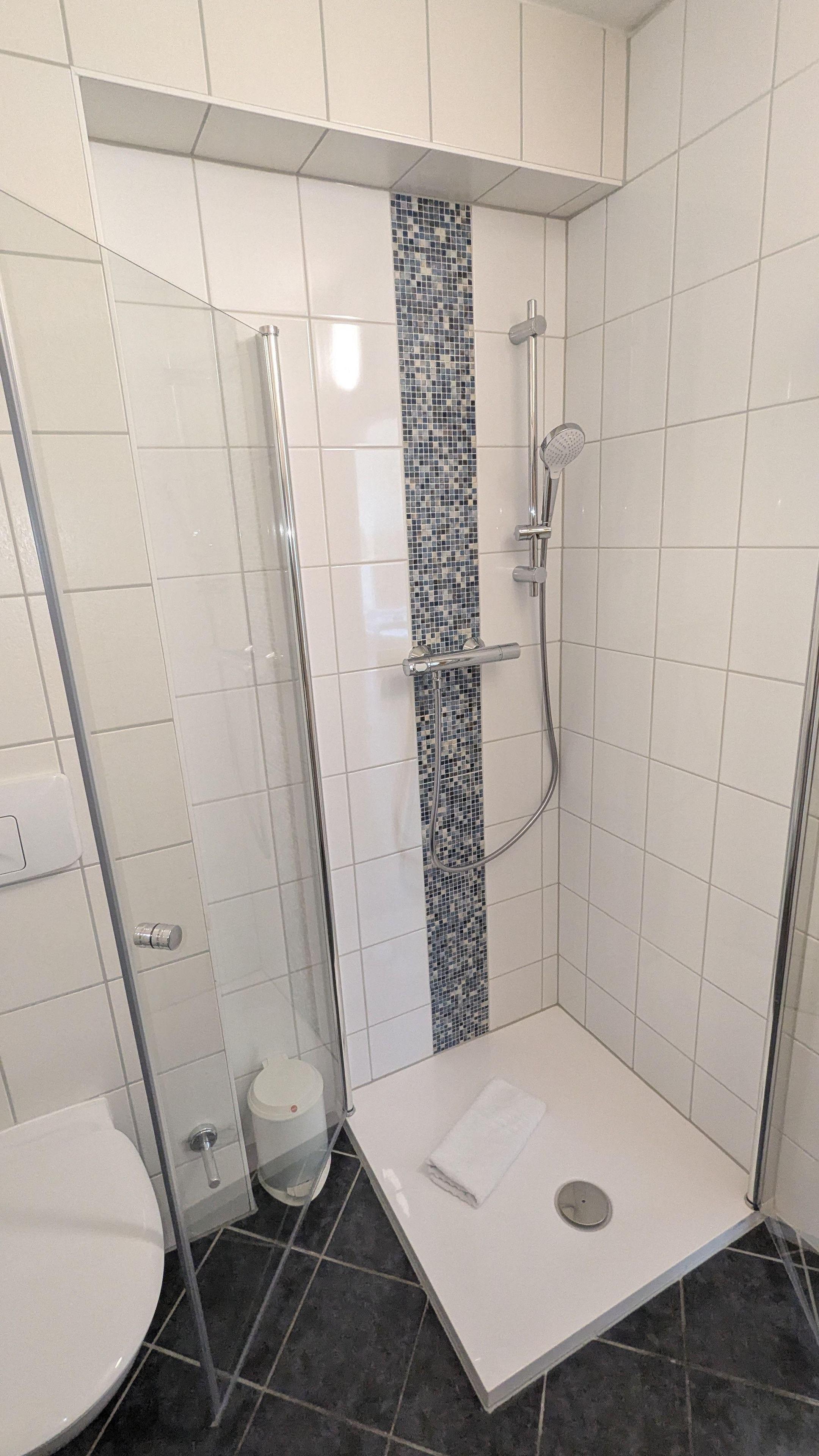 Das Badezimmer verfügt über eine Dusche, ein Waschbecken und ein WC.