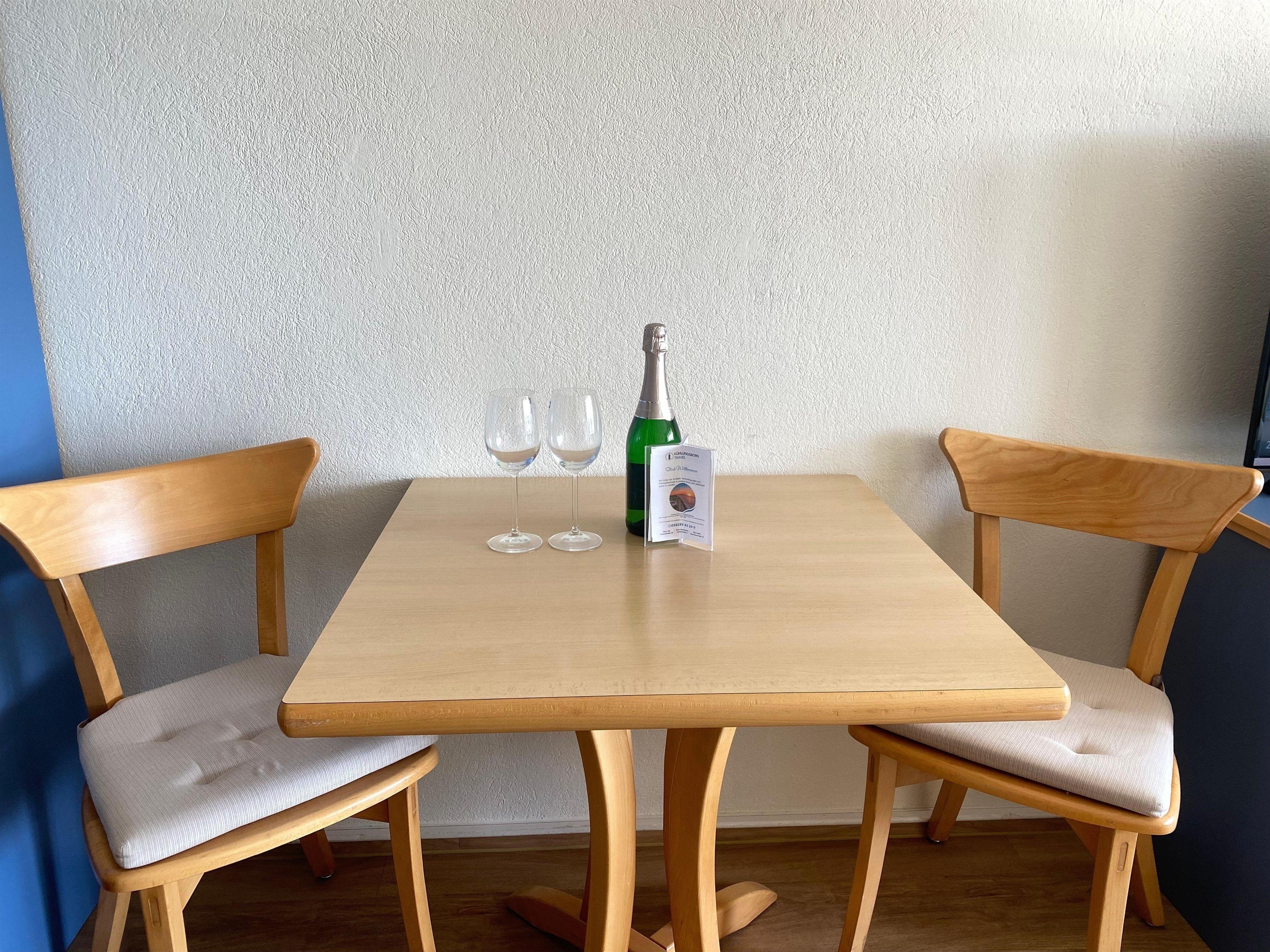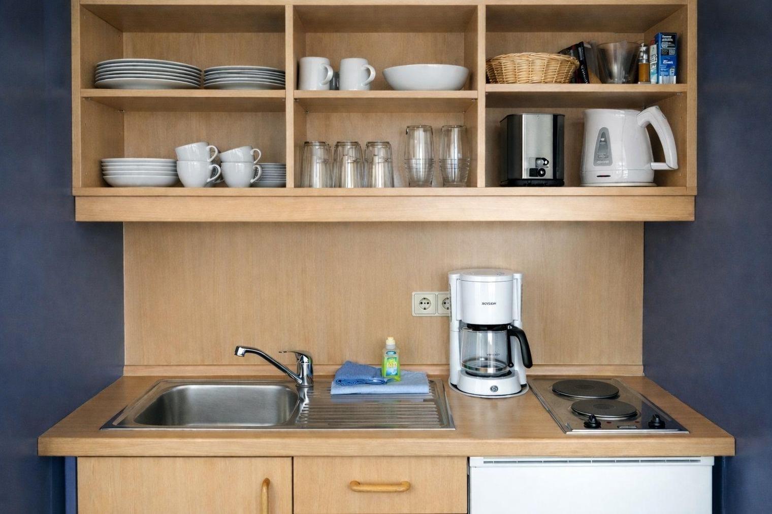 An den Wohn-/Schlafbereich grenzt die kleine, voll ausgestattete Küchenzeile, in der Sie schnell Ihre Lieblingsmahlzeit zaubern können. Es ist an alles gedacht.