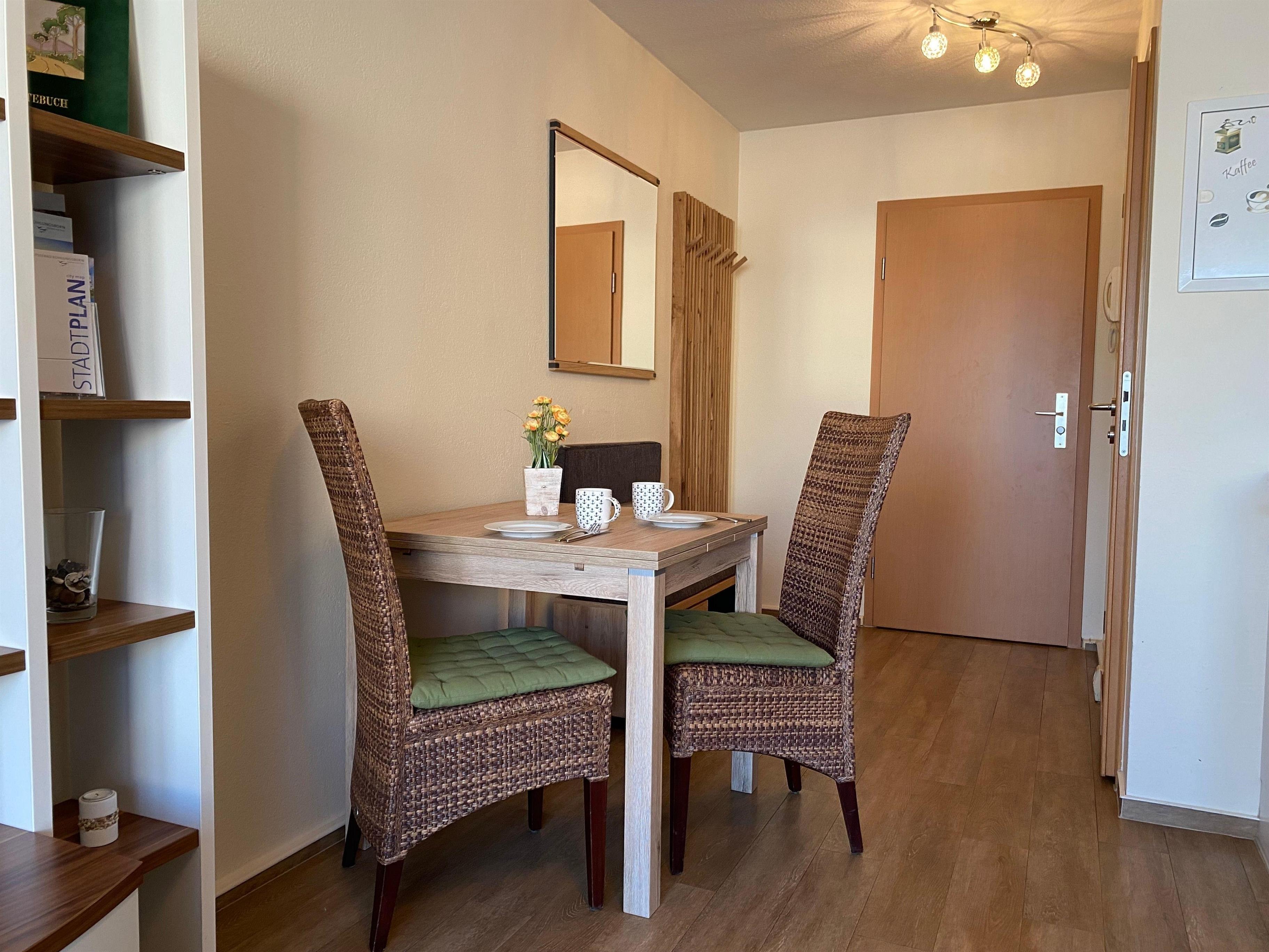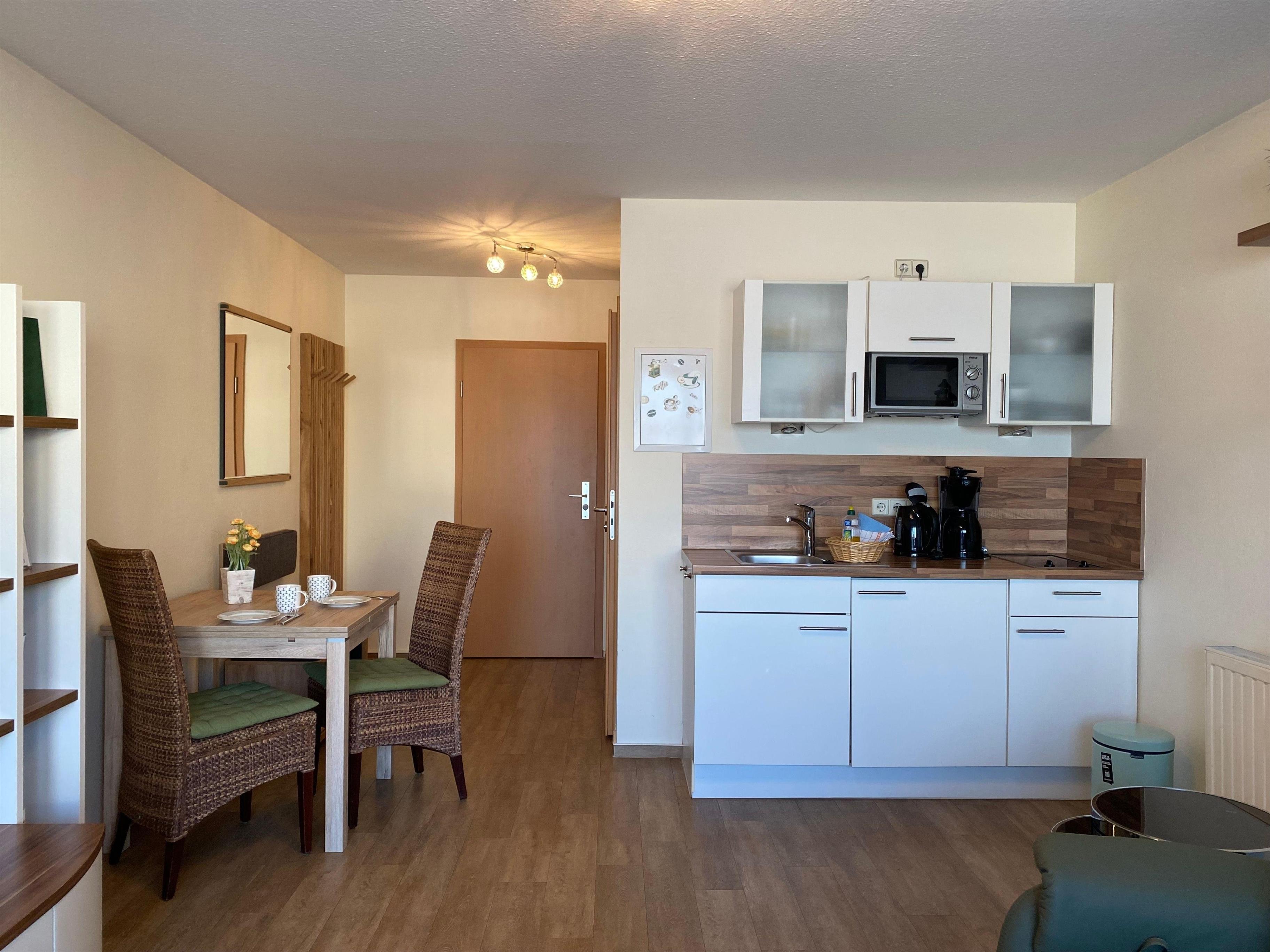 An den Wohnbereich grenzt der Essbereich mit einer kleinen, voll ausgestatteten Küchenzeile. Hier müssen Sie für die Zubereitung Ihrer Mahlzeiten auf nichts verzichten.