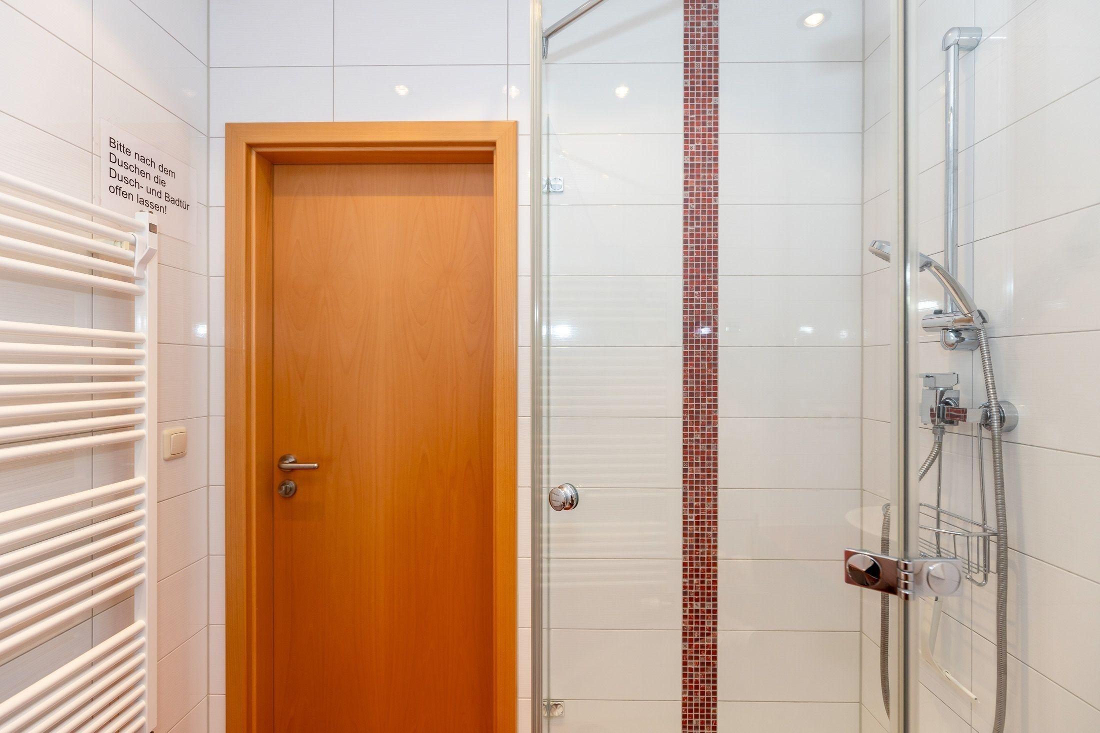Das Badezimmer ist mit einer Dusche, einem Föhn, einem Waschbecken, einem Handtuchheizkörper und einem WC ausgestattet.