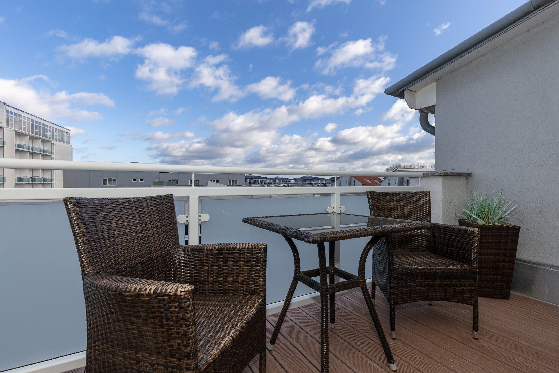 Genießen Sie Ihren Aufenthalt auf dem zur Seeseite ausgerichteten Balkon. Für ein behagliches Beisammensein im Freien stehen moderne Balkonmöbel für Sie bereit. Am Tag können Sie hier ein wenig Sonne tanken und am Abend in gemütlicher Runde einen ereignisreichen Tag gemeinsam ausklingen lassen.