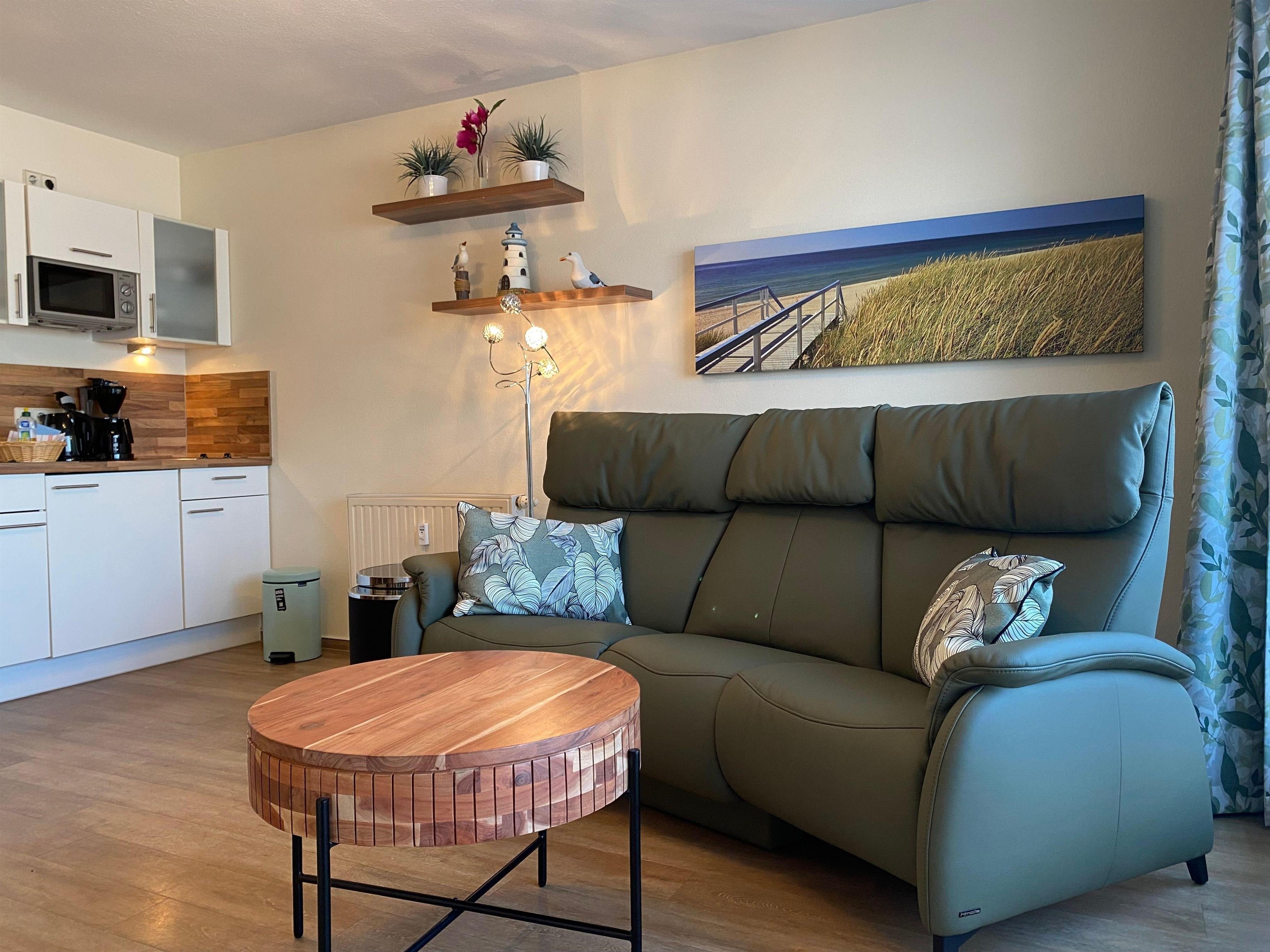 Der Wohnbereich strahlt Wärme und Behaglichkeit aus und ist mit stilvollem Mobiliar eingerichtet. Das neue Ledersofa lädt am Abend zu gemütlichen Stunden ein. Es lässt sich mit einfachen Handgriffen in Liegeposition verstellen, und die mittige Sitzfläche kann heruntergeklappt werden, sodass eine Ablage für Getränke und Snacks entsteht. Ein Flachbildschirm sorgt für Unterhaltung. Der Bluetooth-Tischlautsprecher neben dem Sofa ergänzt das Soundsystem. Sie können Ihr Smartphone ganz einfach verbinden und Ihre Lieblingsmusik abspielen. Zusätzlich ist kabelloses Laden möglich.